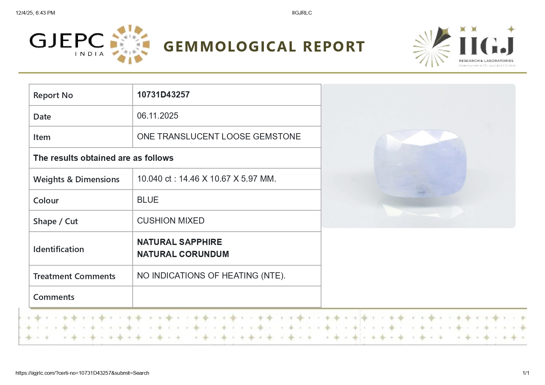 Buy one beautiful 10.04 carat/ 11.03 ratti pure blue sapphire.It has a cushion shape and a clarity grade of clean (evaluated at eye level), good intense color intensity. The origin of this neelam stone is sri-lanka(ceylon). This real blue sapphires is unheated & untreated and certified from IIGJ goverment lab.
