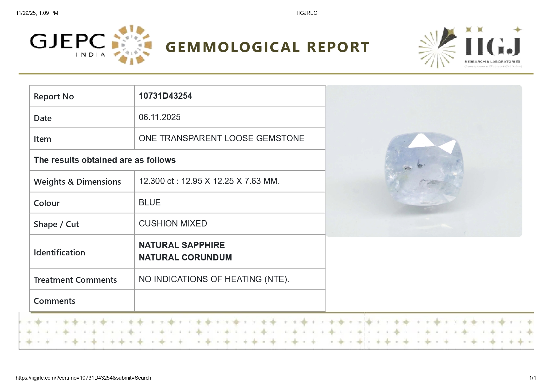 Buy one beautiful 12.30 carat/ 13.52 ratti pure blue sapphire.It has a cushion shape and a clarity grade of clean (evaluated at eye level), good intense color intensity. The origin of this neelam stone is sri-lanka(ceylon). This real blue sapphires is unheated & untreated and certified from IIGJ goverment lab.