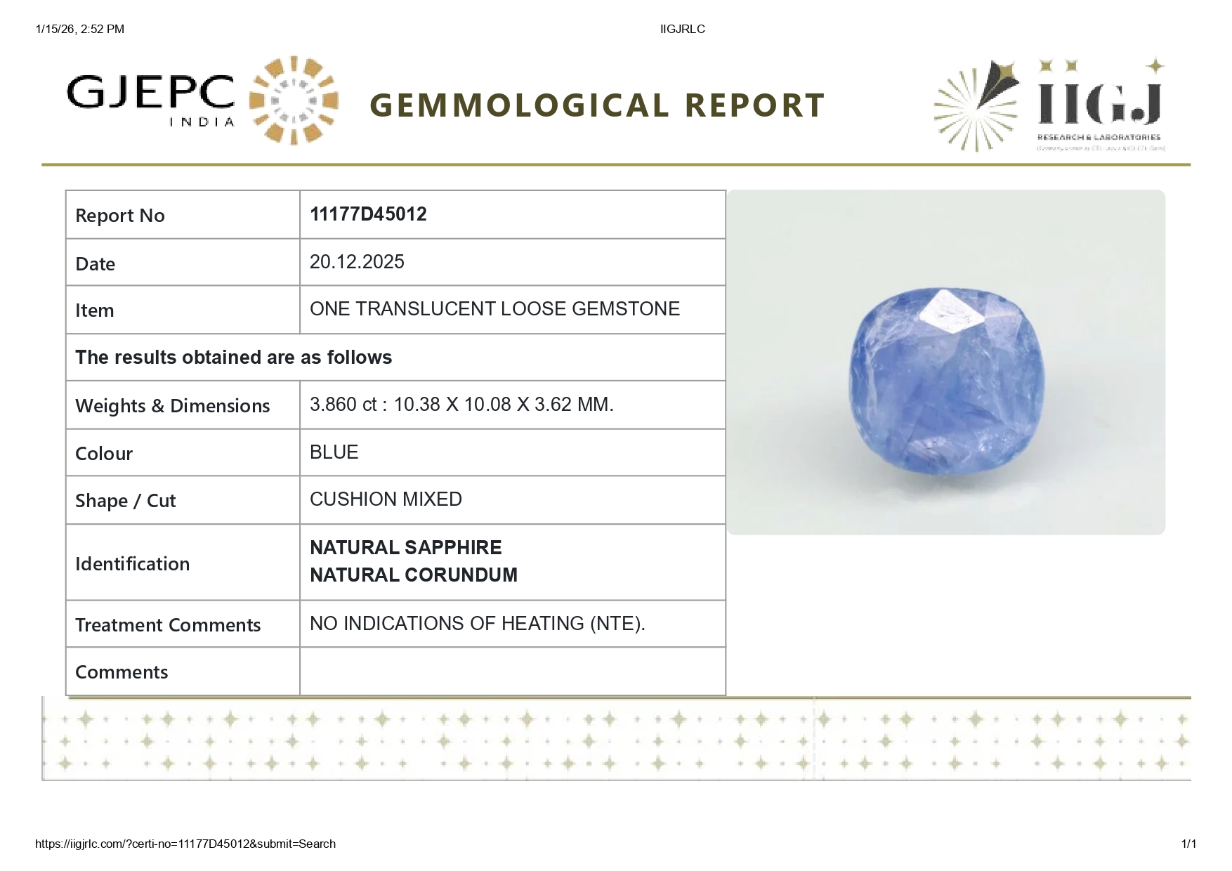Buy one beautiful 3.86 carat/ 4.24 ratti pure blue sapphire.It has a Cushion shape and a clarity grade of clean (evaluated at eye level), good intense color intensity. The origin of this neelam stone is sri-lanka(ceylon). This real blue sapphires is unheated & untreated and certified from IIGJ goverment lab.