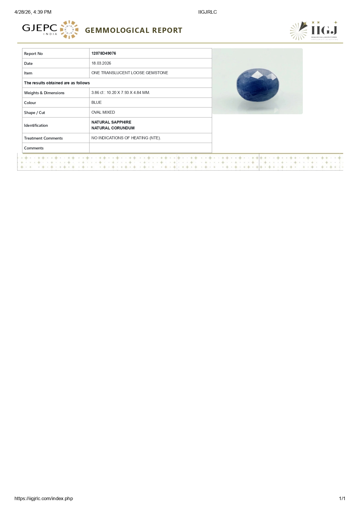 Buy one beautiful 3.86 carat/ 4.24 ratti pure blue sapphire.It has a oval shape and a clarity grade of clean (evaluated at eye level), good intense color intensity. The origin of this neelam stone is sri-lanka(ceylon). This real blue sapphires is unheated & untreated and certified from IIGJ goverment lab.