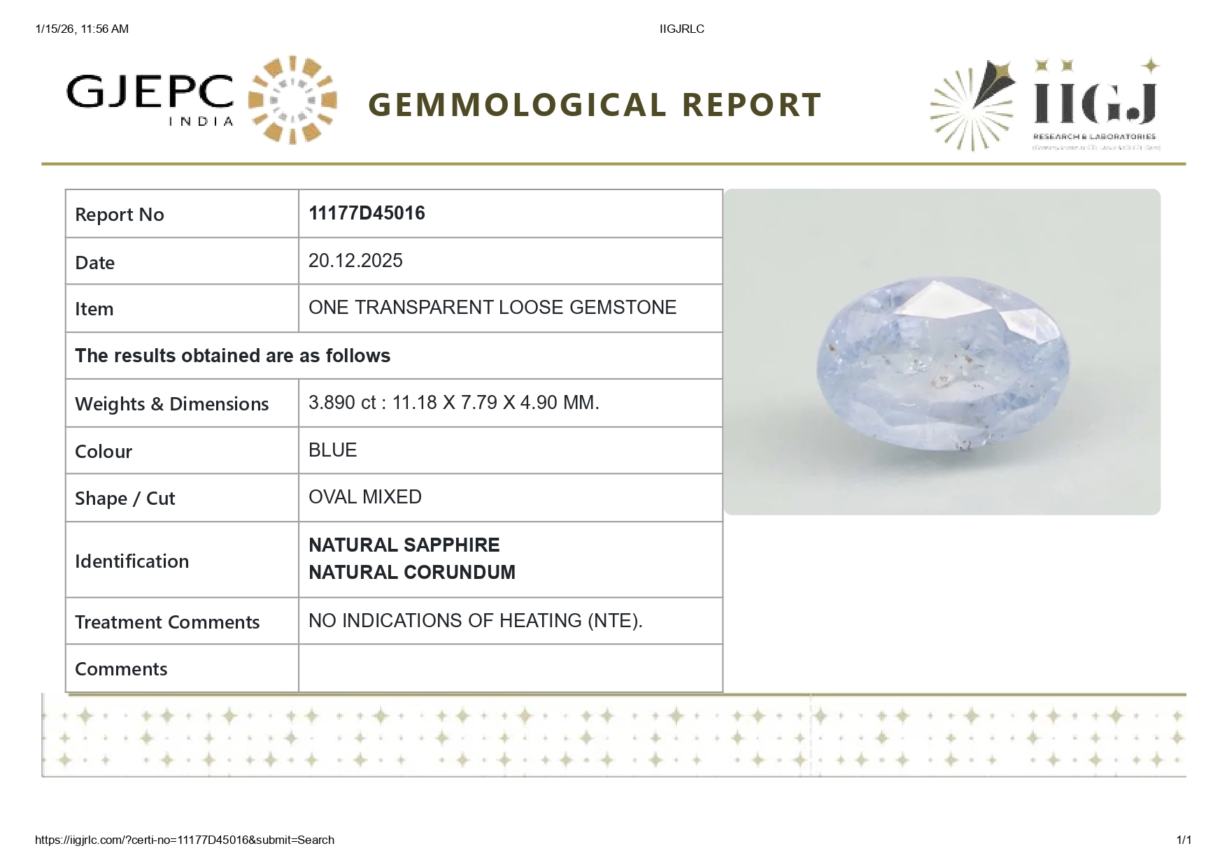 Buy one beautiful 3.89 carat/ 4.27 ratti pure blue sapphire.It has a Oval shape and a clarity grade of clean (evaluated at eye level), good intense color intensity. The origin of this neelam stone is sri-lanka(ceylon). This real blue sapphires is unheated & untreated and certified from IIGJ goverment lab.