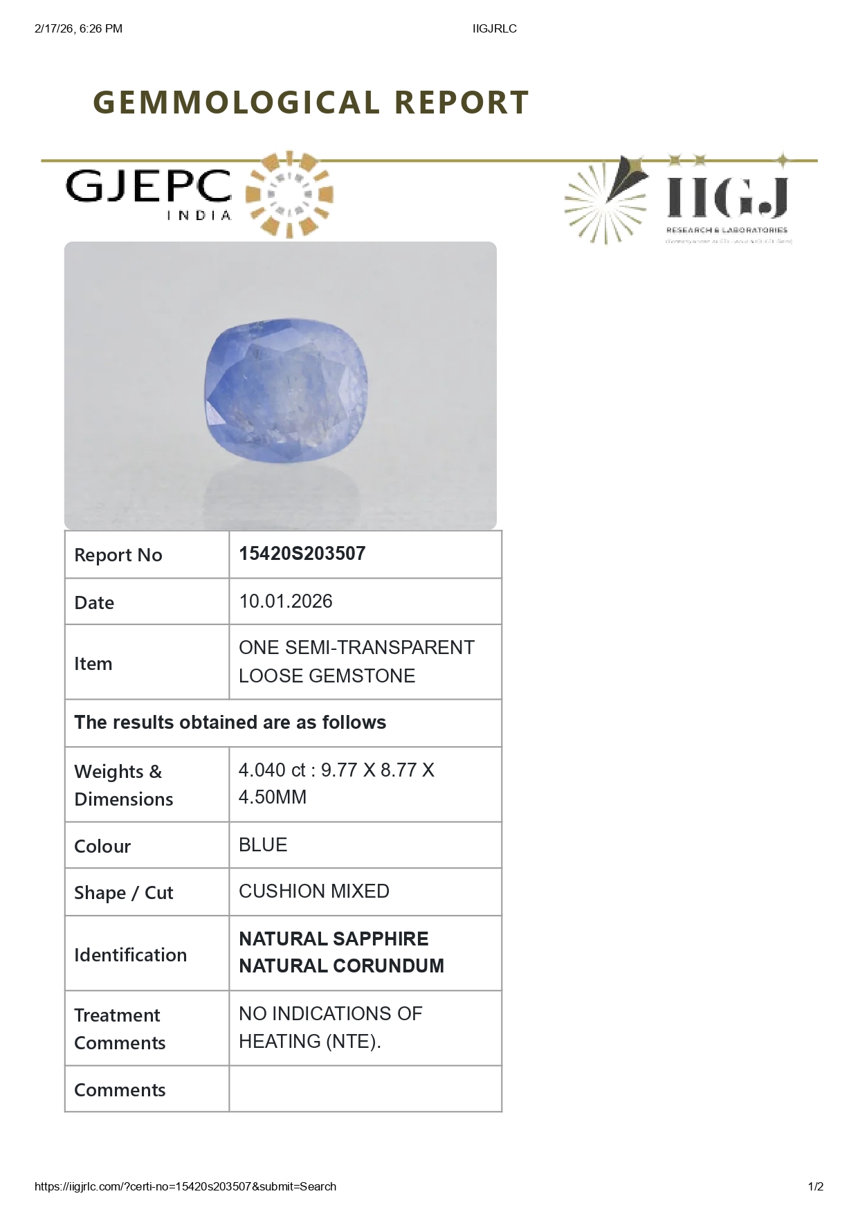Buy one beautiful 4.04 carat/ 4.44 ratti pure blue sapphire.It has a cushion shape and a clarity grade of clean (evaluated at eye level), good intense color intensity. The origin of this neelam stone is sri-lanka(ceylon). This real blue sapphires is unheated & untreated and certified from IIGJ goverment lab.