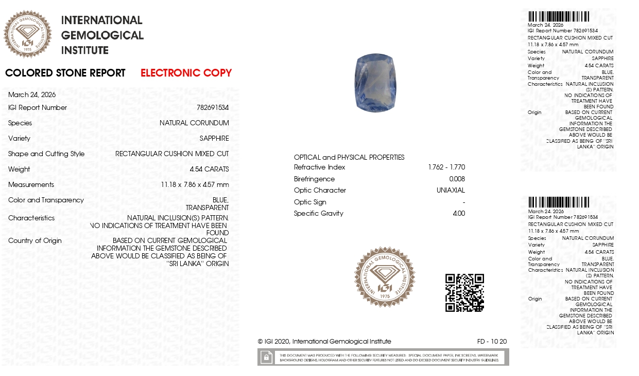 Buy one beautiful 4.54 carat/ 4.99 ratti pure blue sapphire.It has a cushion shape and a clarity grade of clean (evaluated at eye level), good intense color intensity. The origin of this neelam stone is sri-lanka(ceylon). This real blue sapphires is unheated & untreated and certified from IGI goverment lab.