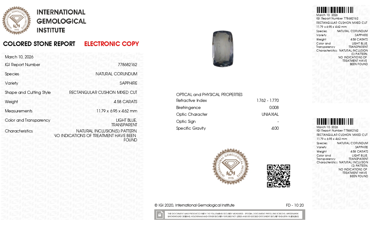 Buy one beautiful 4.58 carat/ 5.03 ratti pure blue sapphire.It has a rectangular cushion shape and a clarity grade of clean (evaluated at level), good intense color intensity. The origin of this neelam stone is sri-lanka(ceylon). This real blue sapphires is unheated & untreated and certified from IGI goverment lab.