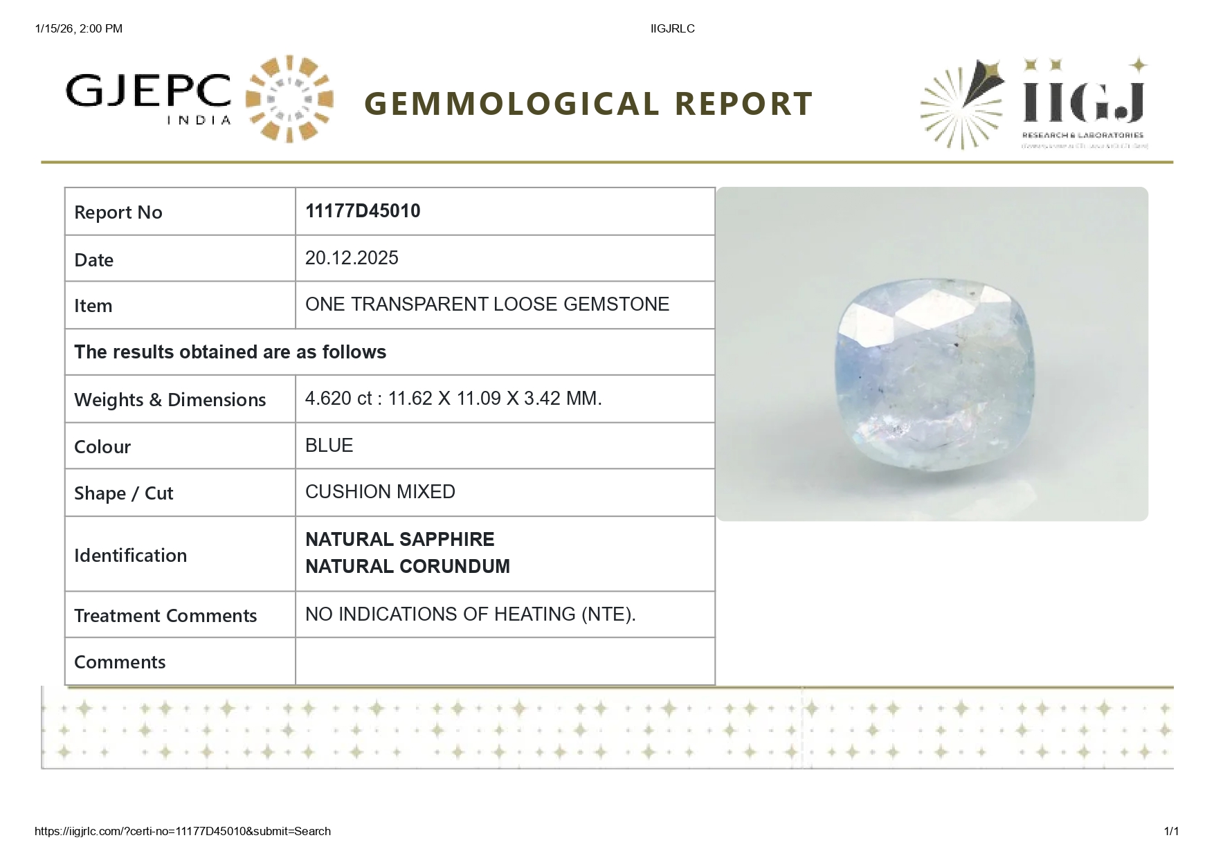 Buy one beautiful 4.62 carat/ 5.08 ratti pure blue sapphire.It has a Cushion shape and a clarity grade of clean (evaluated at eye level), good intense color intensity. The origin of this neelam stone is sri-lanka(ceylon). This real blue sapphires is unheated & untreated and certified from IIGJ goverment lab.