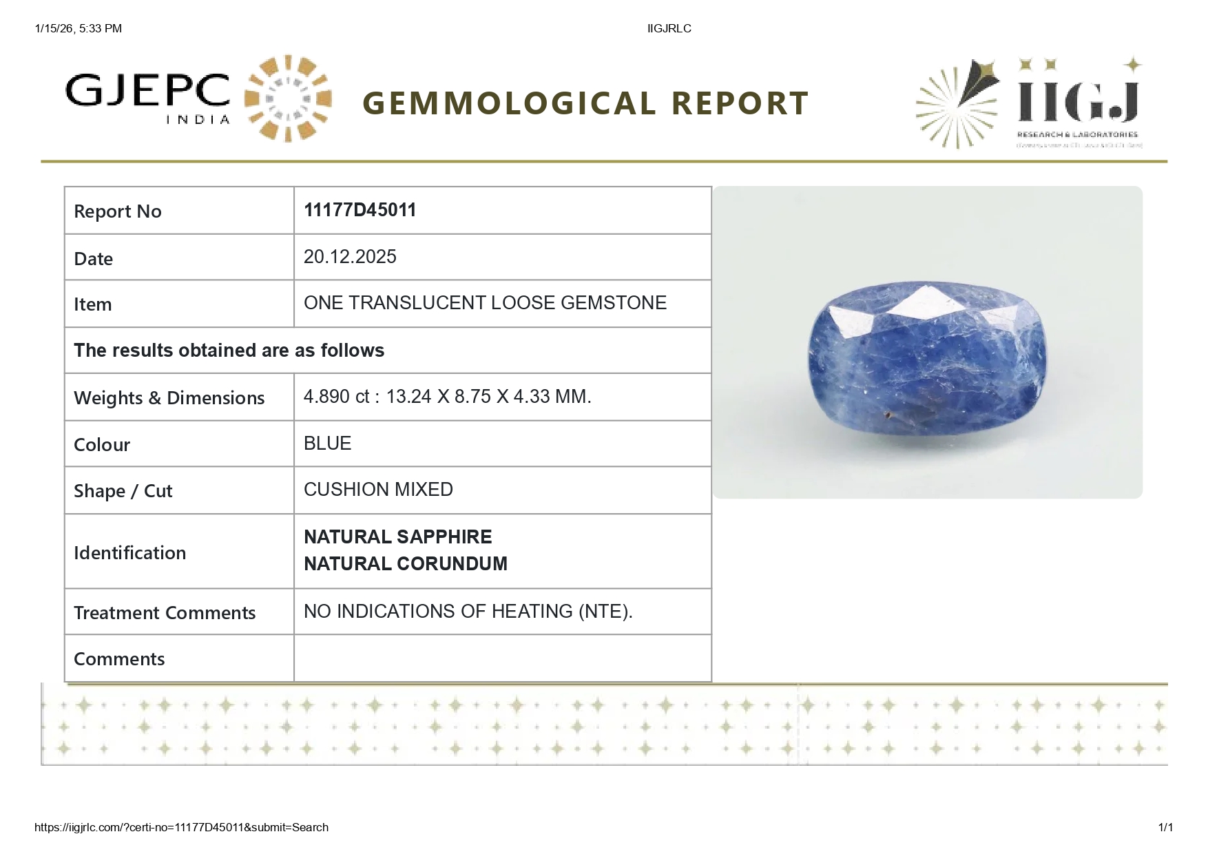 Buy one beautiful 4.89 carat/ 5.37 ratti pure blue sapphire.It has a Cushion shape and a clarity grade of clean (evaluated at eye level), good intense color intensity. The origin of this neelam stone is sri-lanka(ceylon). This real blue sapphires is unheated & untreated and certified from IIGJ goverment lab.