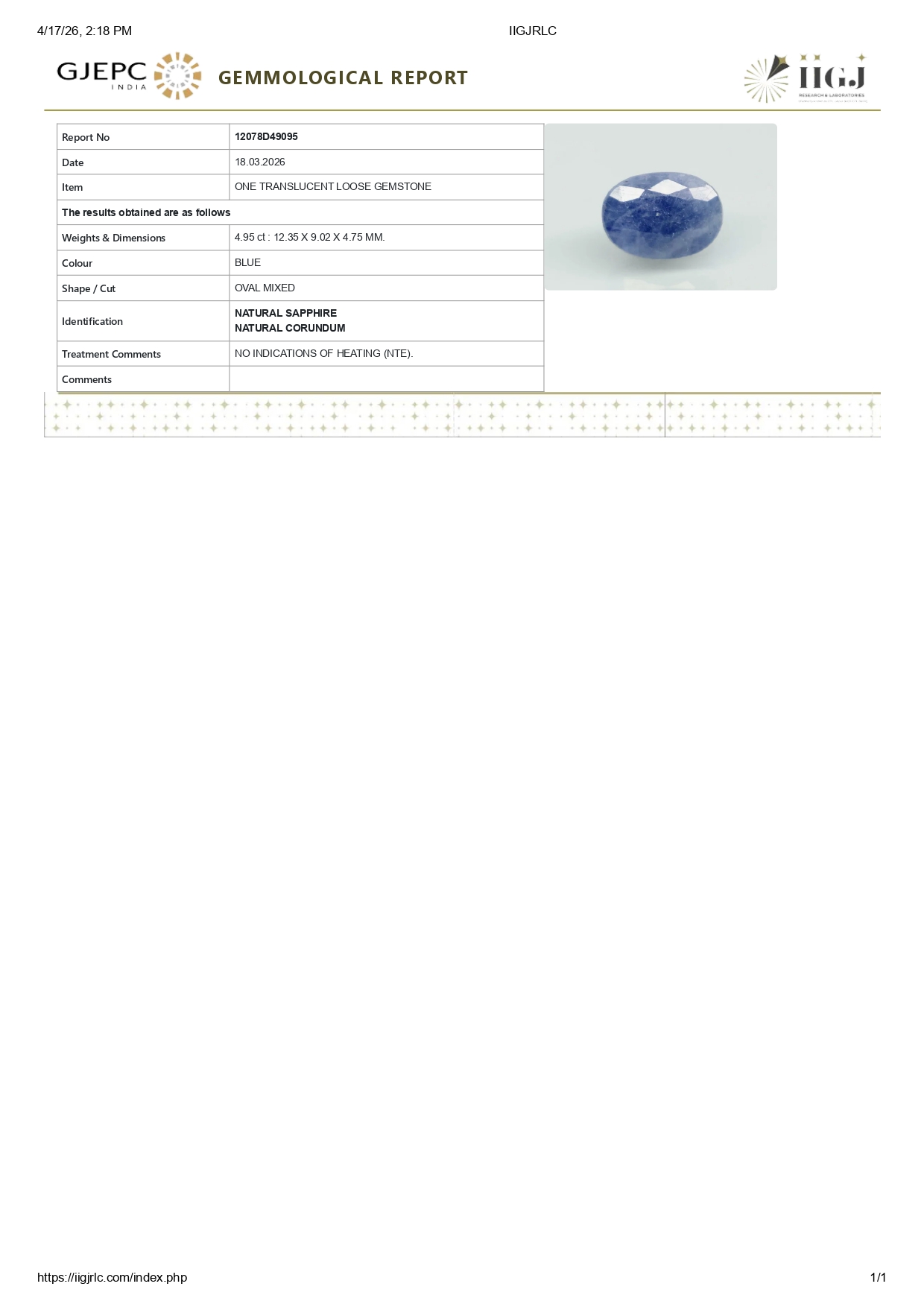 Buy one beautiful 4.95 carat/ 5.44 ratti pure blue sapphire.It has a oval shape and a clarity grade of clean (evaluated at eye level), good intense color intensity. The origin of this neelam stone is sri-lanka(ceylon). This real blue sapphires is unheated & untreated and certified from IIGJ goverment lab.