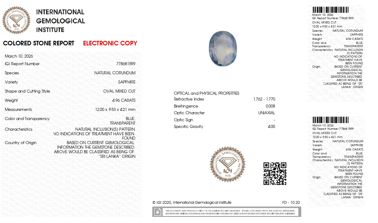Buy one beautiful 4.96 carat/ 5.45 ratti pure blue sapphire.It has a oval shape and a clarity grade of clean (evaluated at eye level), good intense color intensity. The origin of this neelam stone is sri-lanka(ceylon). This real blue sapphires is unheated & untreated and certified from IGI goverment lab.