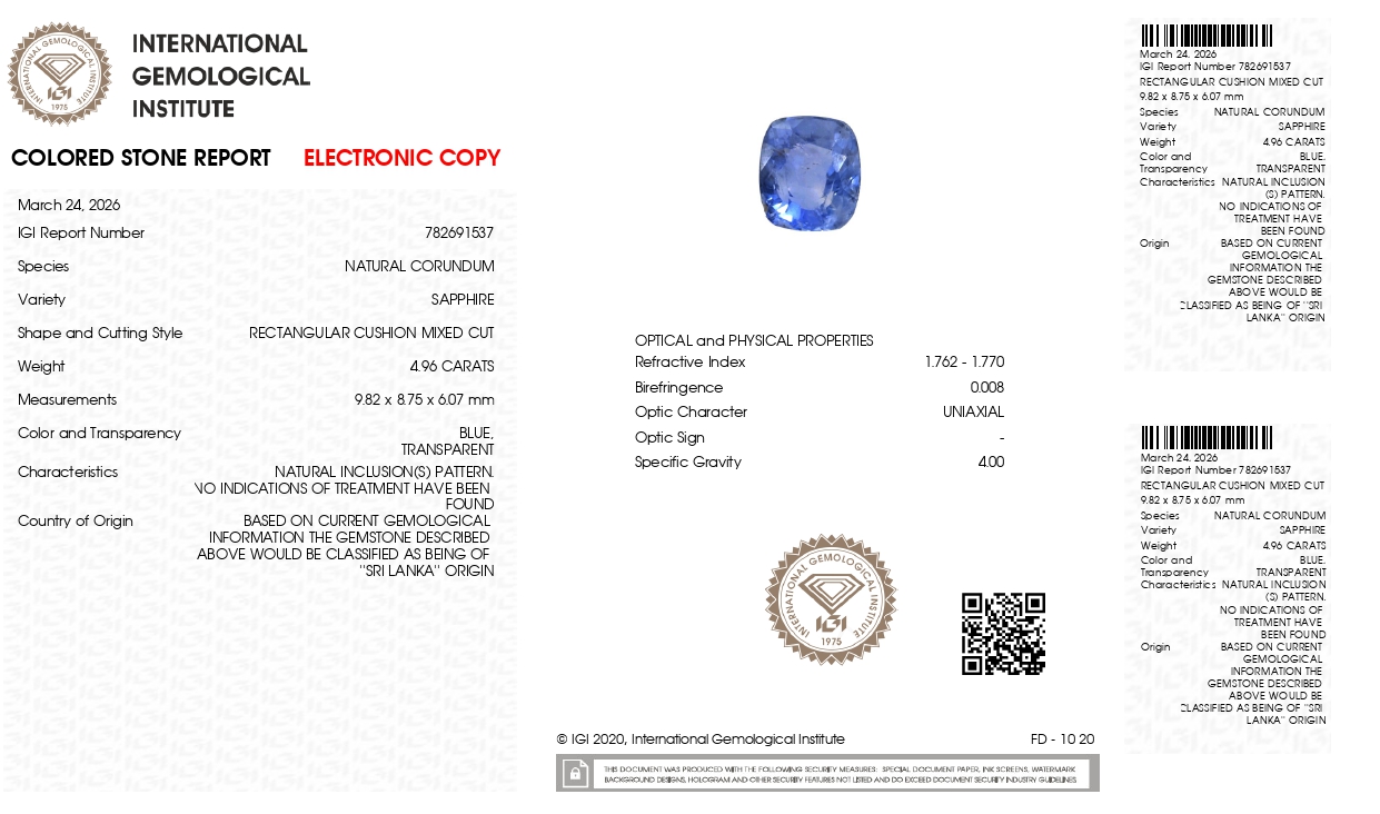 Buy one beautiful 4.96 carat/ 5.45 ratti pure blue sapphire.It has a cushion shape and a clarity grade of clean (evaluated at eye level), good intense color intensity. The origin of this neelam stone is sri-lanka(ceylon). This real blue sapphires is unheated & untreated and certified from IGI goverment lab.