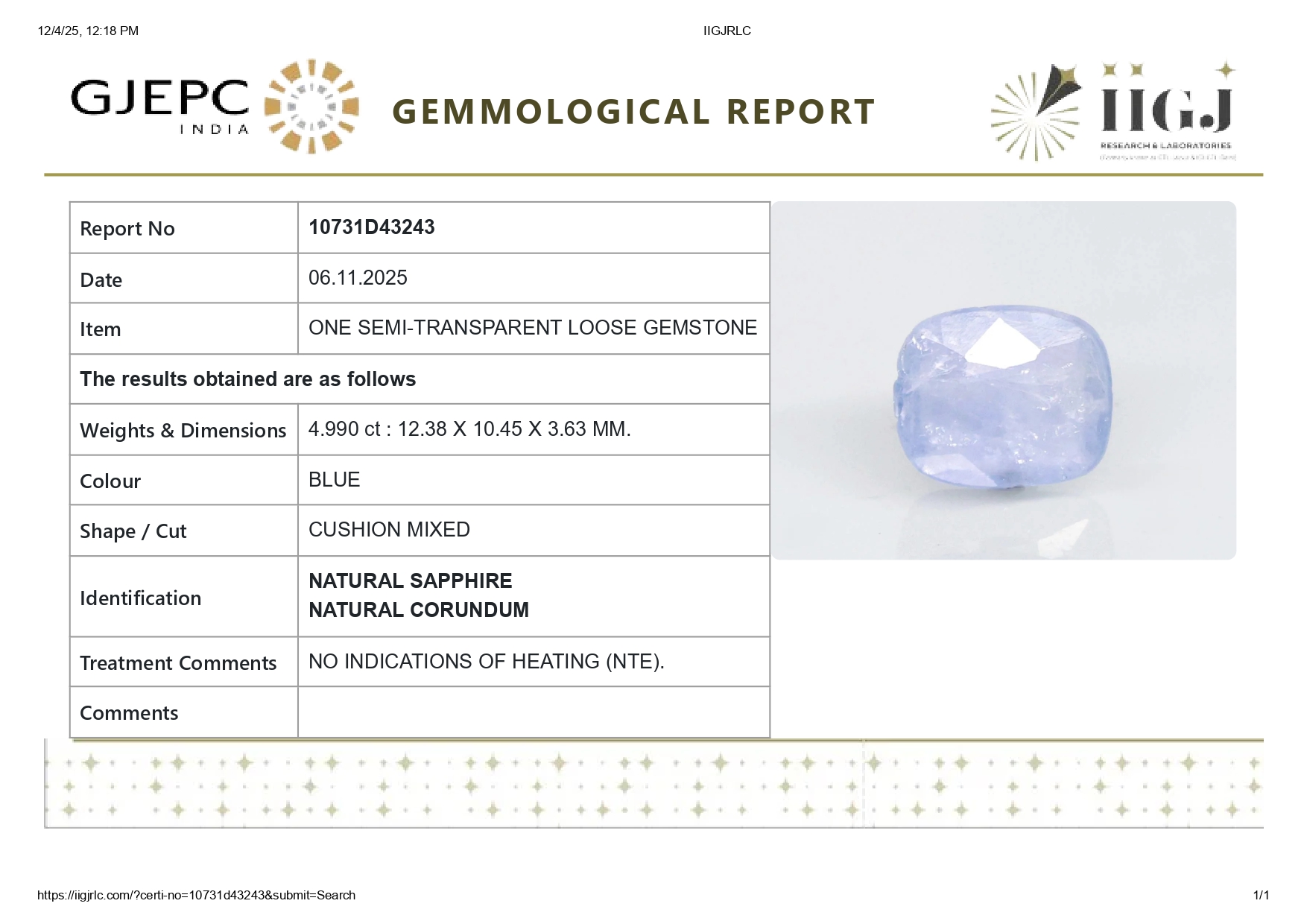 Buy one beautiful 4.99 carat/ 5.48 ratti pure blue sapphire.It has a cushion shape and a clarity grade of clean (evaluated at eye level), good intense color intensity. The origin of this neelam stone is sri-lanka(ceylon). This real blue sapphires is unheated & untreated and certified from IIGJ goverment lab.