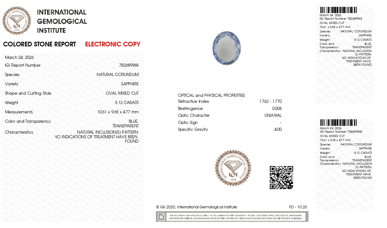 Buy one beautiful 5.12 carat/ 5.63 ratti pure blue sapphire.It has a oval shape and a clarity grade of clean (evaluated at eye level), good intense color intensity. The origin of this neelam stone is sri-lanka(ceylon). This real blue sapphires is unheated & untreated and certified from IGI goverment lab.