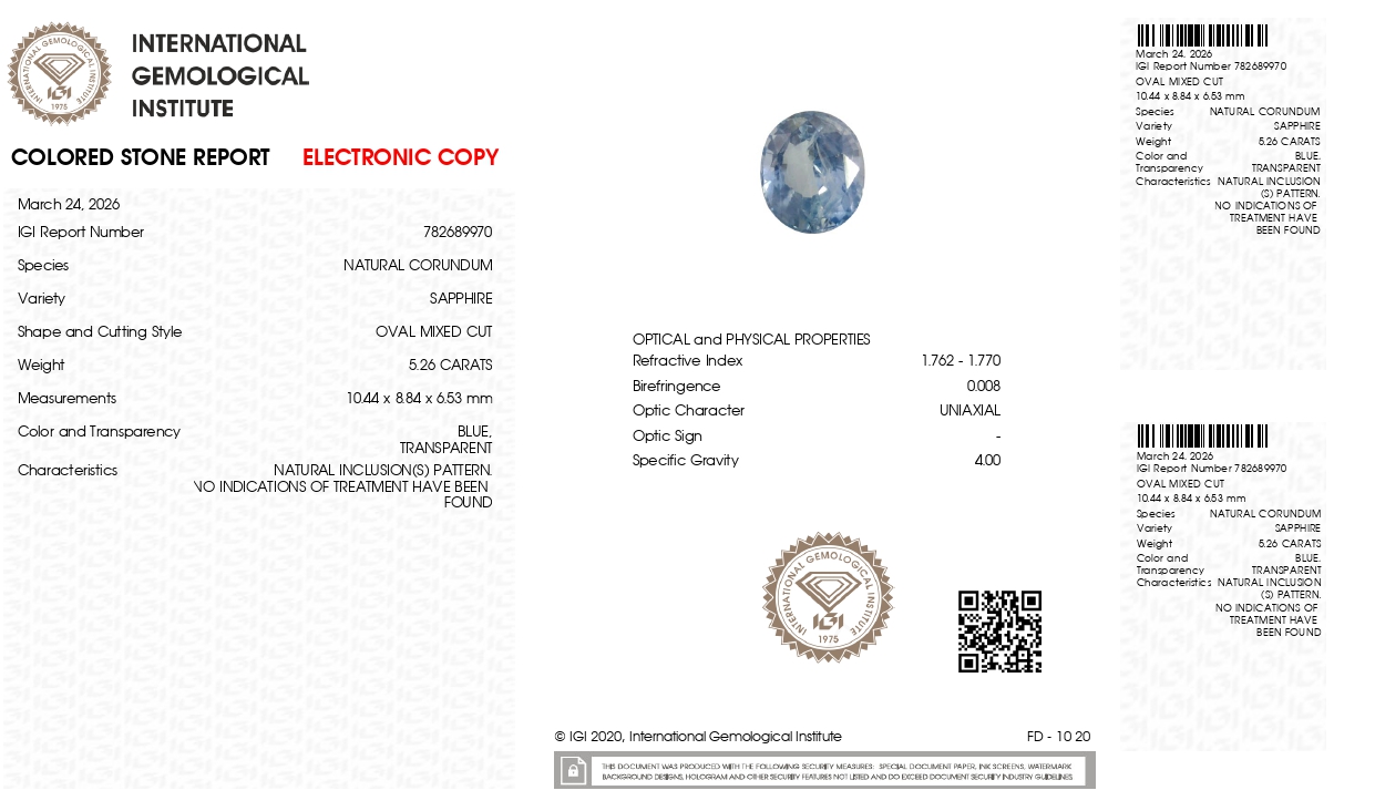 Buy one beautiful 5.26 carat/ 5.78 ratti pure blue sapphire.It has a oval shape and a clarity grade of clean (evaluated at eye level), good intense color intensity. The origin of this neelam stone is sri-lanka(ceylon). This real blue sapphires is unheated & untreated and certified from IGI goverment lab.