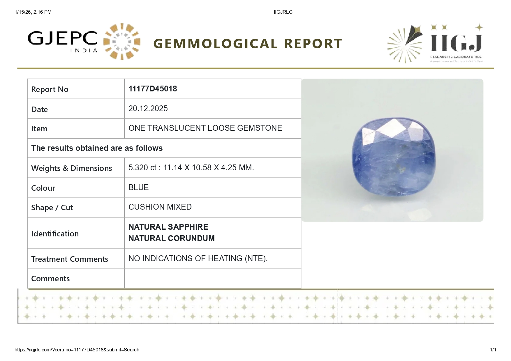 Buy one beautiful 5.32 carat/ 5.85 ratti pure blue sapphire.It has a Cushion shape and a clarity grade of clean (evaluated at eye level), good intense color intensity. The origin of this neelam stone is sri-lanka(ceylon). This real blue sapphires is unheated & untreated and certified from IIGJ goverment lab.
