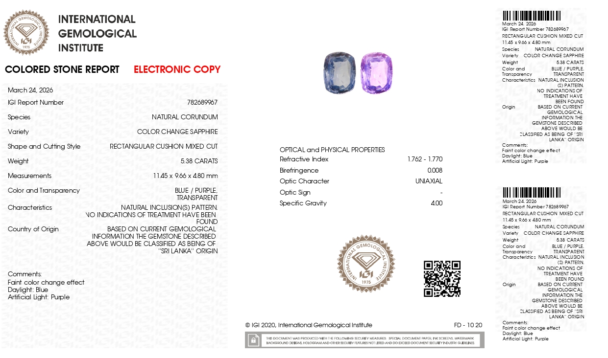 Buy one beautiful 5.38 carat/ 5.91 ratti pure blue sapphire.It has a Rectangular cushion shape and a clarity grade of clean (evaluated at level), good intense color intensity. The origin of this neelam stone is sri-lanka(ceylon). This real blue sapphires is unheated & untreated and certified from IGI goverment lab.