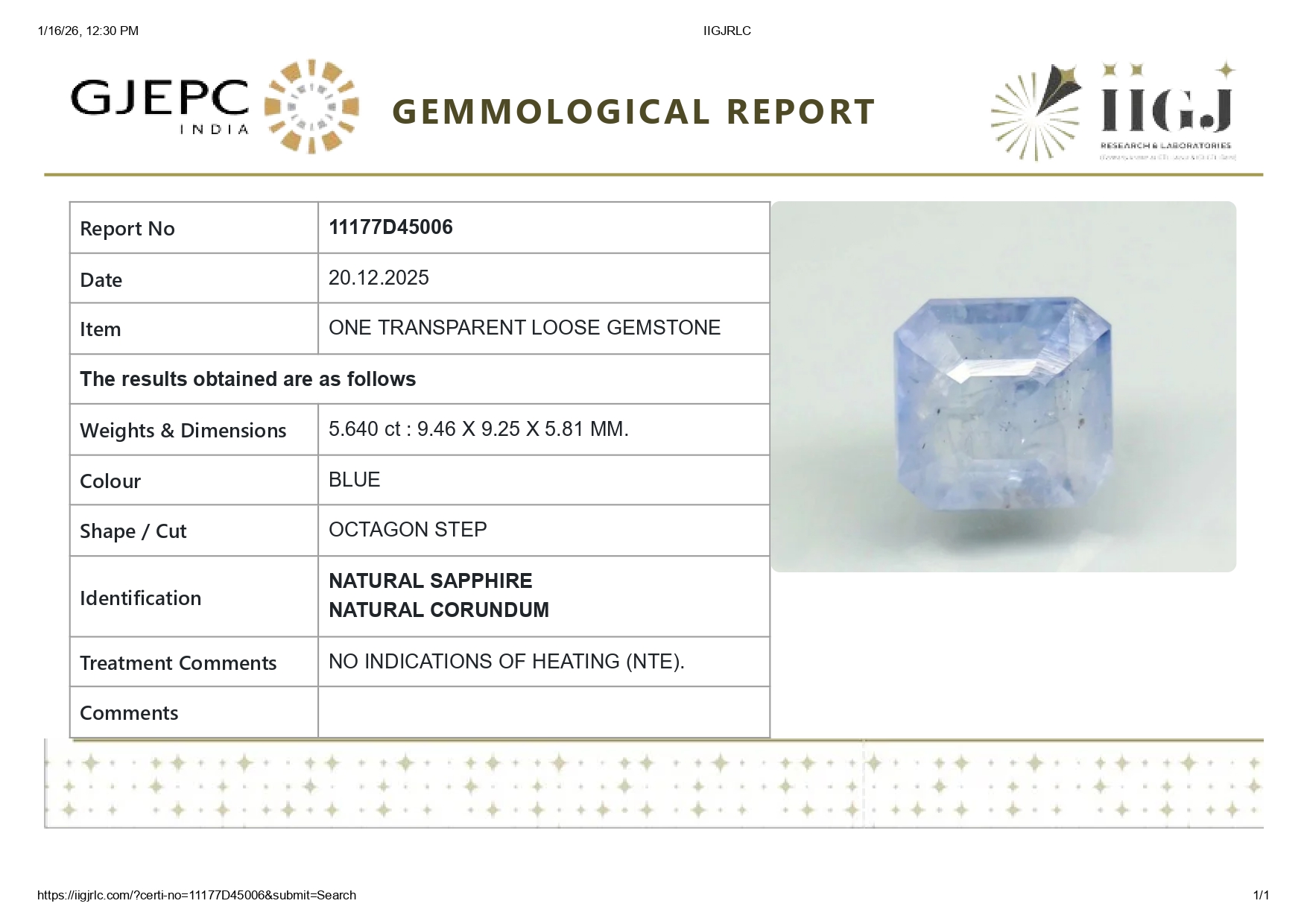 Buy one beautiful 5.64 carat/ 6.20 ratti pure blue sapphire.It has a Octagon shape and a clarity grade of clean (evaluated at eye level), good intense color intensity. The origin of this neelam stone is sri-lanka(ceylon). This real blue sapphires is unheated & untreated and certified from IIGJ goverment lab.