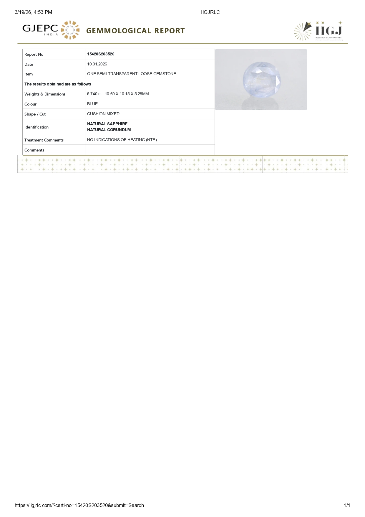 Buy one beautiful 5.74 carat/ 6.31 ratti pure blue sapphire.It has a cushion shape and a clarity grade of clean (evaluated at eye level), good intense color intensity. The origin of this neelam stone is sri-lanka(ceylon). This real blue sapphires is unheated & untreated and certified from IIGJ goverment lab.