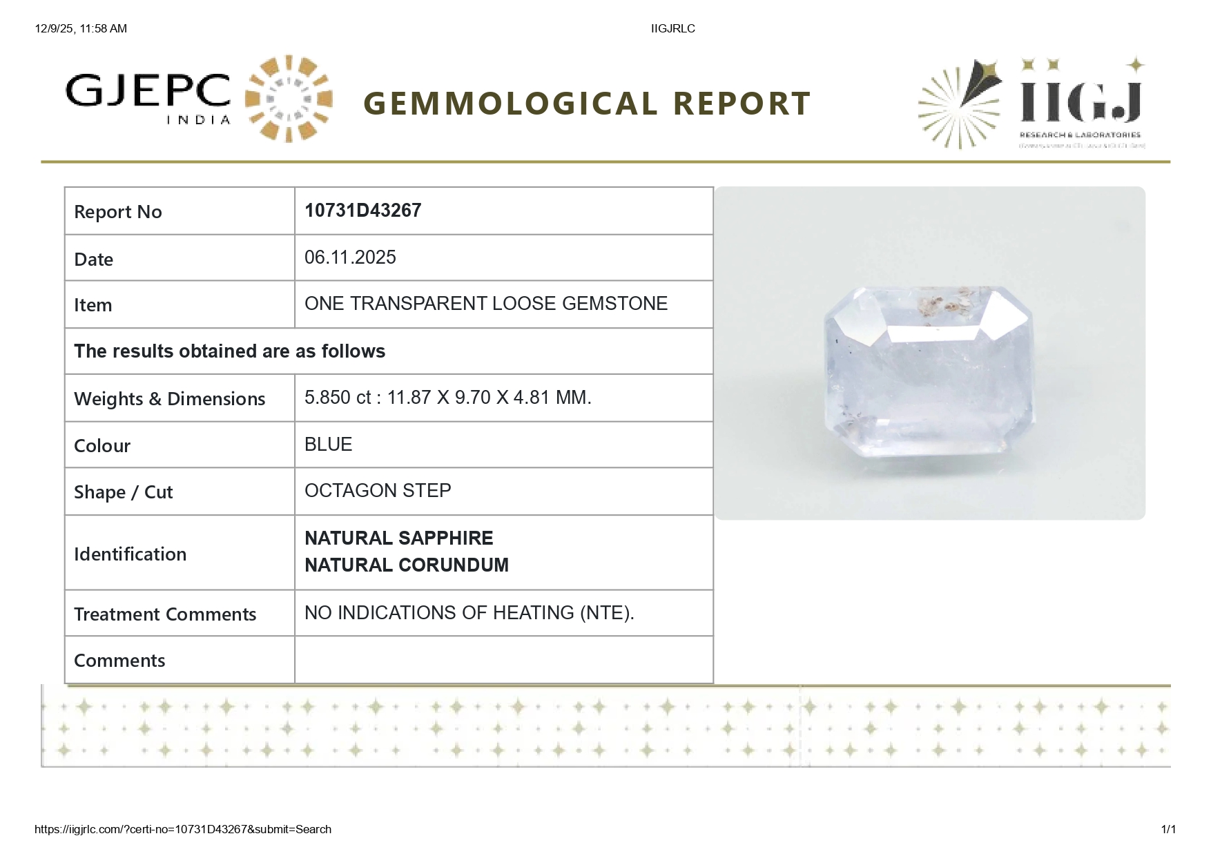 Buy one beautiful 5.85 carat/ 6.43 ratti pure blue sapphire.It has a emerald cut shape and a clarity grade of clean (evaluated at eye level), good intense color intensity. The origin of this neelam stone is sri-lanka(ceylon). This real blue sapphires is unheated & untreated and certified from IIGJ goverment lab.