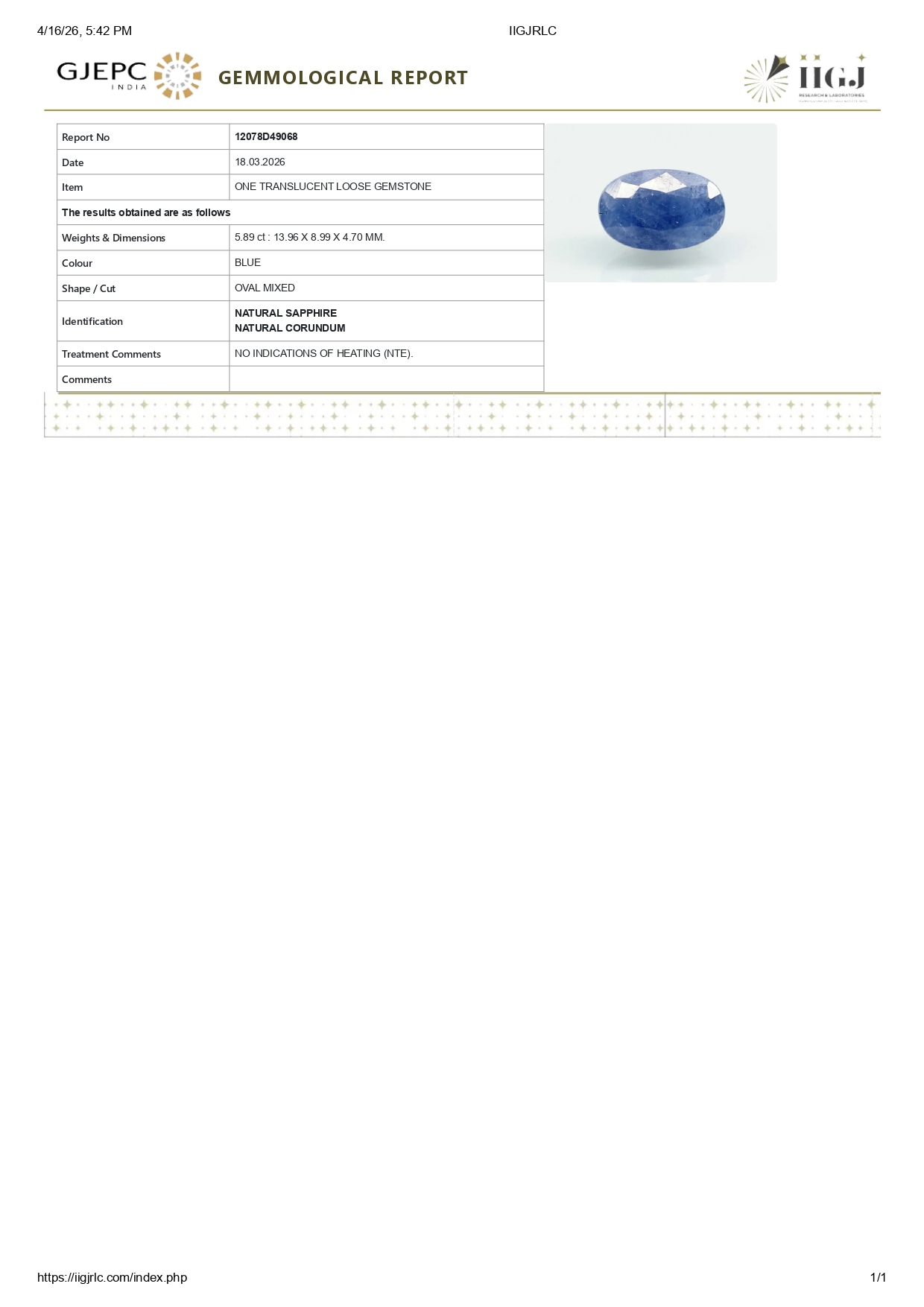 Buy one beautiful 5.89 carat/ 6.37 ratti pure blue sapphire.It has a oval shape and a clarity grade of clean (evaluated at eye level), good intense color intensity. The origin of this neelam stone is sri-lanka(ceylon). This real blue sapphires is unheated & untreated and certified from IIGJ goverment lab.