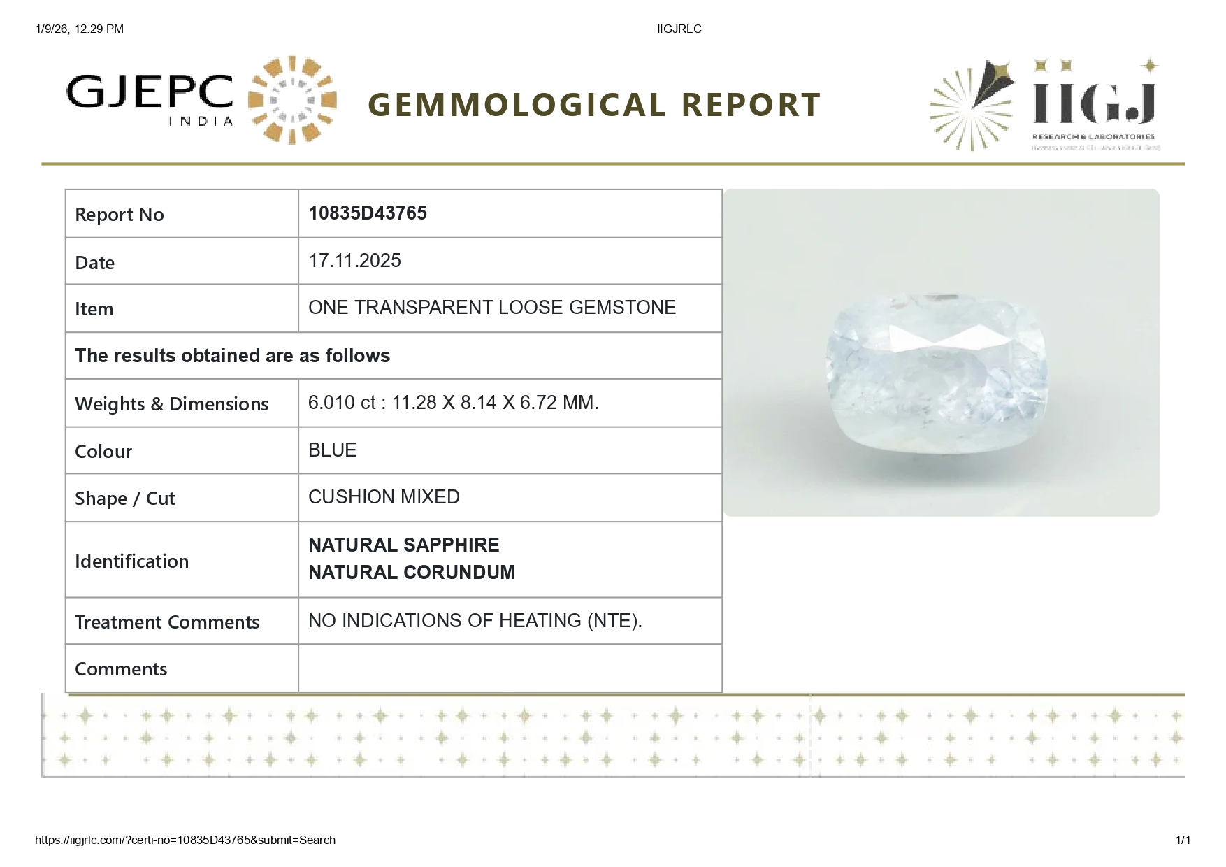 Buy one beautiful 6.01 carat/ 6.60 ratti pure blue sapphire.It has a Cushion shape and a clarity grade of clean (evaluated at eye level), good intense color intensity. The origin of this neelam stone is sri-lanka(ceylon). This real blue sapphires is unheated & untreated and certified from IIGJ goverment lab.