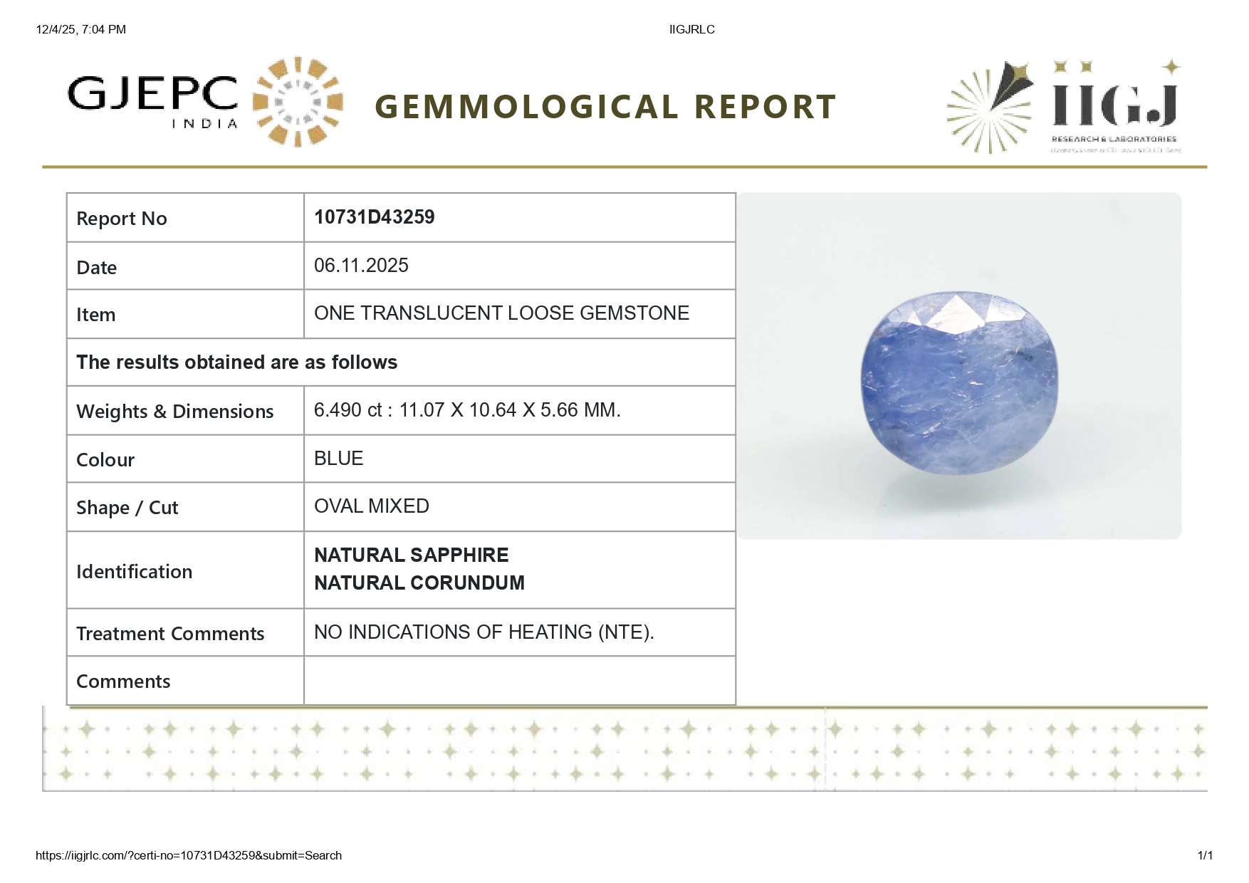 Buy one beautiful 6.49 carat/ 7.13 ratti pure blue sapphire.It has a oval shape and a clarity grade of clean (evaluated at eye level), good intense color intensity. The origin of this neelam stone is sri-lanka(ceylon). This real blue sapphires is unheated & untreated and certified from IIGJ goverment lab.