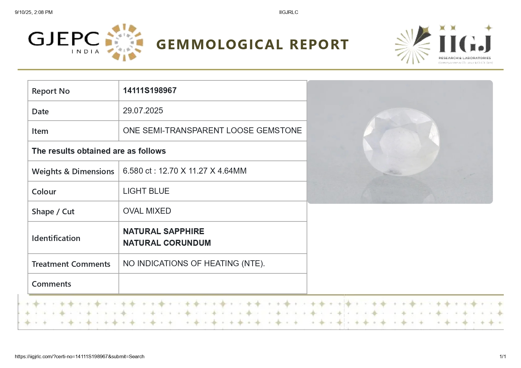 Buy one beautiful 6.58 carat/ 7.23 ratti pure blue sapphire.It has a Oval shape and a clarity grade of clean (evaluated at eye level), good intense color intensity. The origin of this neelam stone is sri-lanka(ceylon). This real blue sapphires is unheated & untreated and certified from IIGJ goverment lab.