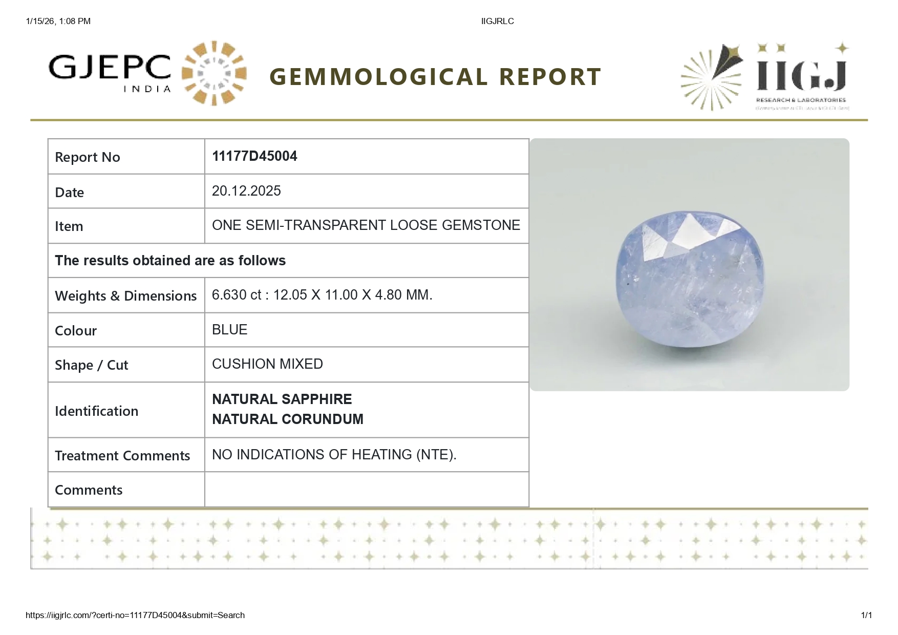Buy one beautiful 6.63 carat/ 7.29 ratti pure blue sapphire.It has a Cushion shape and a clarity grade of clean (evaluated at eye level), good intense color intensity. The origin of this neelam stone is sri-lanka(ceylon). This real blue sapphires is unheated & untreated and certified from IIGJ goverment lab.
