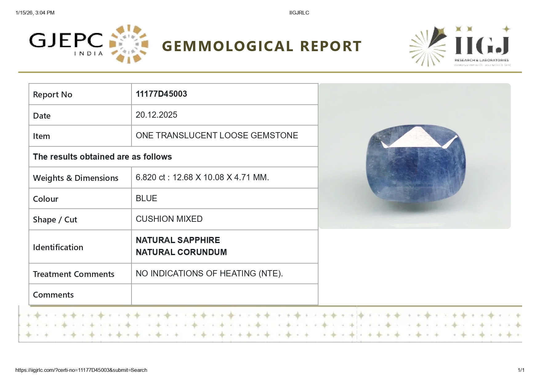 Buy one beautiful 6.82 carat/ 7.49 ratti pure blue sapphire.It has a Cushion shape and a clarity grade of clean (evaluated at eye level), good intense color intensity. The origin of this neelam stone is sri-lanka(ceylon). This real blue sapphires is unheated & untreated and certified from IIGJ goverment lab.