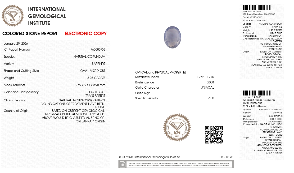 Buy one beautiful 6.98 carat/ 7.67 ratti pure blue sapphire.It has a oval shape and a clarity grade of clean (evaluated at eye level), good intense color intensity. The origin of this neelam stone is sri-lanka(ceylon). This real blue sapphires is unheated & untreated and certified from IGI goverment lab.