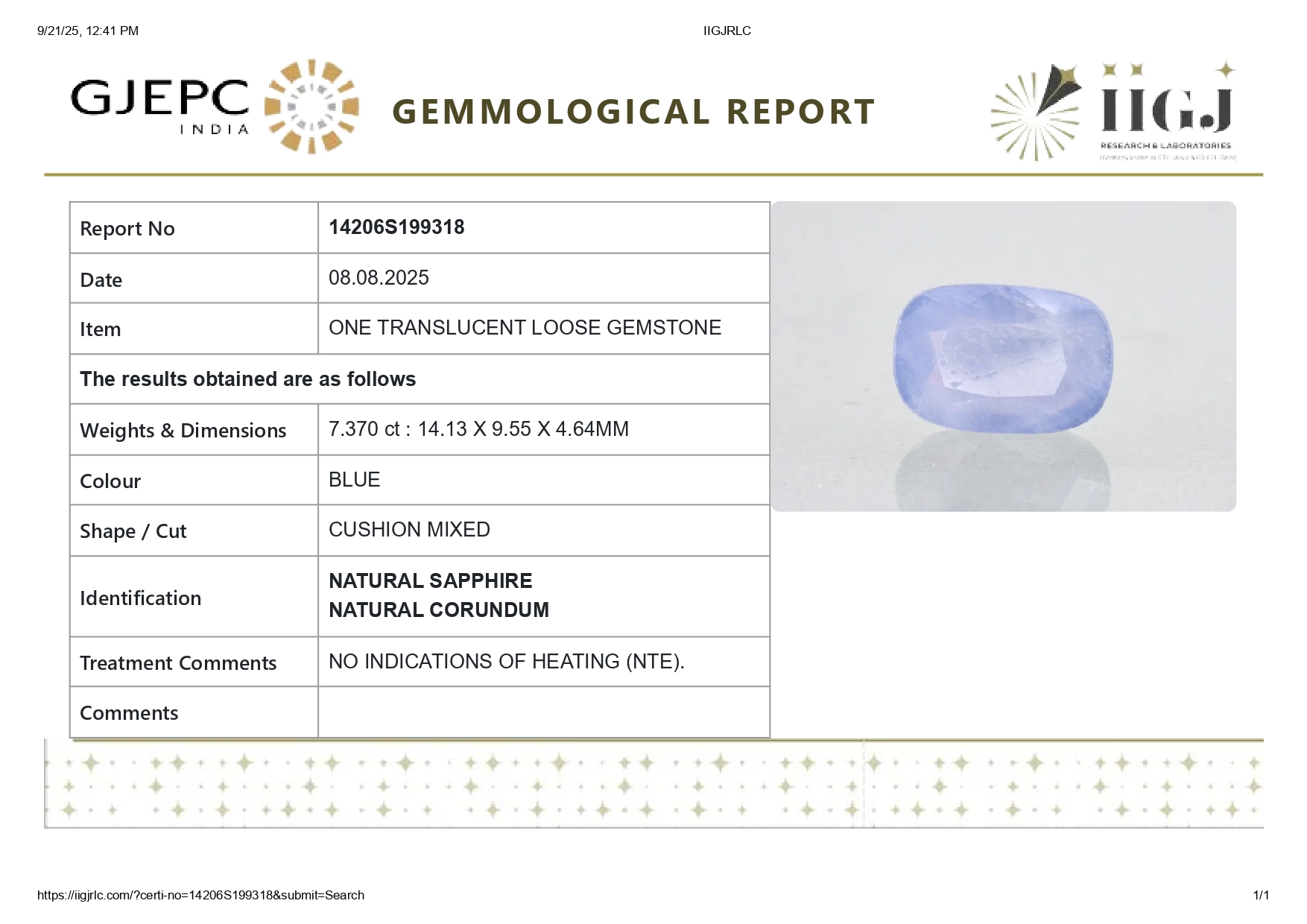 Buy one beautiful 8.37 carat/ 8.10 ratti pure blue sapphire.It has a Cushion shape and a clarity grade of clean (evaluated at eye level), good intense color intensity. The origin of this neelam stone is sri-lanka(ceylon). This real blue sapphires is unheated & untreated and certified from IIGJ goverment lab.