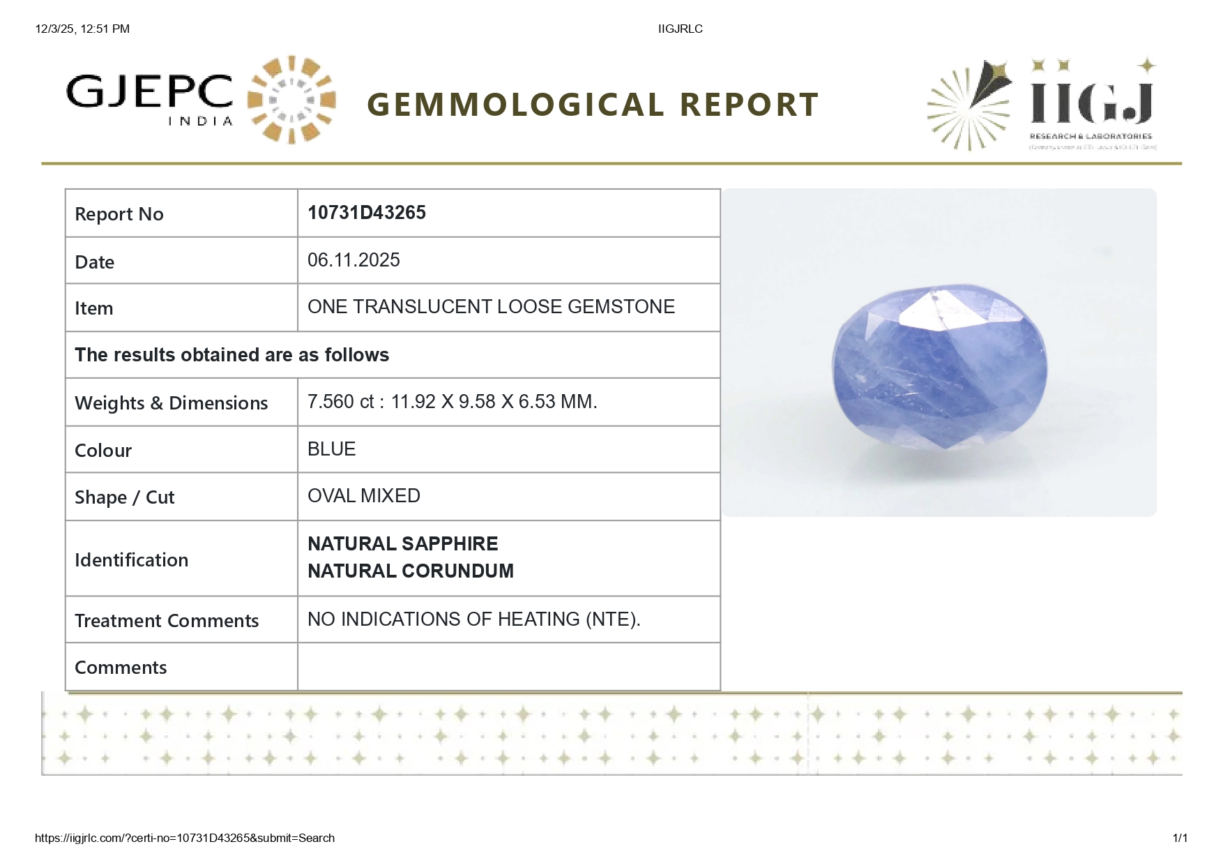 Buy one beautiful 7.56 carat/ 8.31 ratti pure blue sapphire.It has a oval shape and a clarity grade of clean (evaluated at eye level), good intense color intensity. The origin of this neelam stone is sri-lanka(ceylon). This real blue sapphires is unheated & untreated and certified from IIGJ goverment lab.
