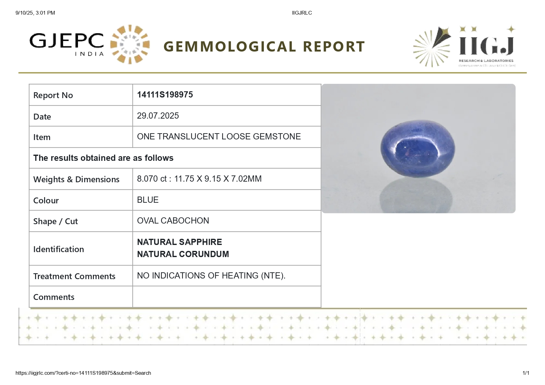 Buy one beautiful 8.07 carat/ 8.87 ratti pure blue sapphire.It has a Oval shape and a clarity grade of clean (evaluated at eye level), good intense color intensity. The origin of this neelam stone is sri-lanka(ceylon). This real blue sapphires is unheated & untreated and certified from IIGJ goverment lab.