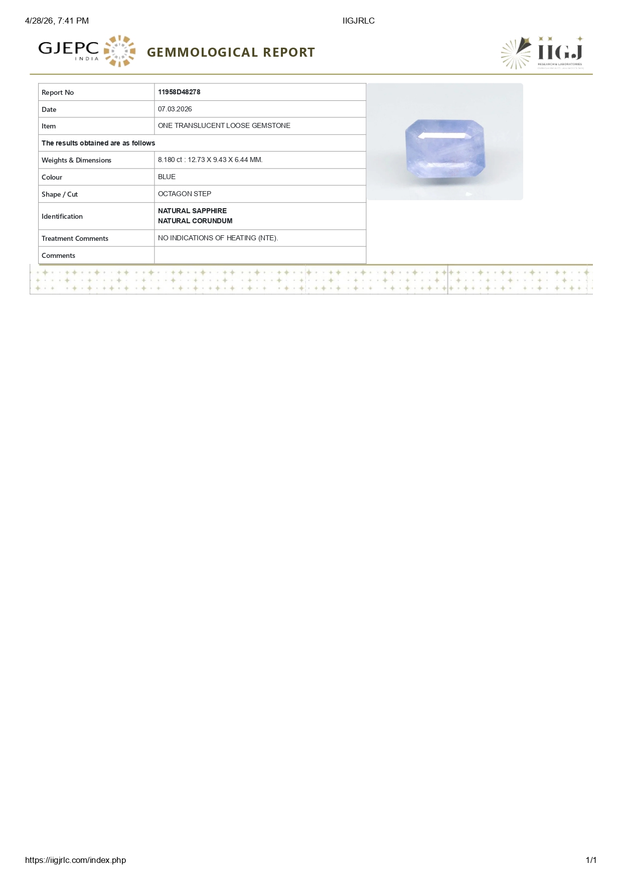 Buy one beautiful 8.18 carat/ 8.99 ratti pure blue sapphire.It has a octagon shape and a clarity grade of clean (evaluated at eye level), good intense color intensity. The origin of this neelam stone is sri-lanka(ceylon). This real blue sapphires is unheated & untreated and certified from IIGJ goverment lab.
