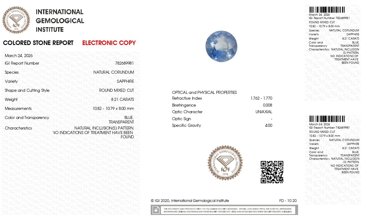 Buy one beautiful 8.21 carat/ 9.02 ratti pure blue sapphire.It has a round shape and a clarity grade of clean (evaluated at level), good intense color intensity. The origin of this neelam stone is sri-lanka(ceylon). This real blue sapphires is unheated & untreated and certified from IGI goverment lab.
