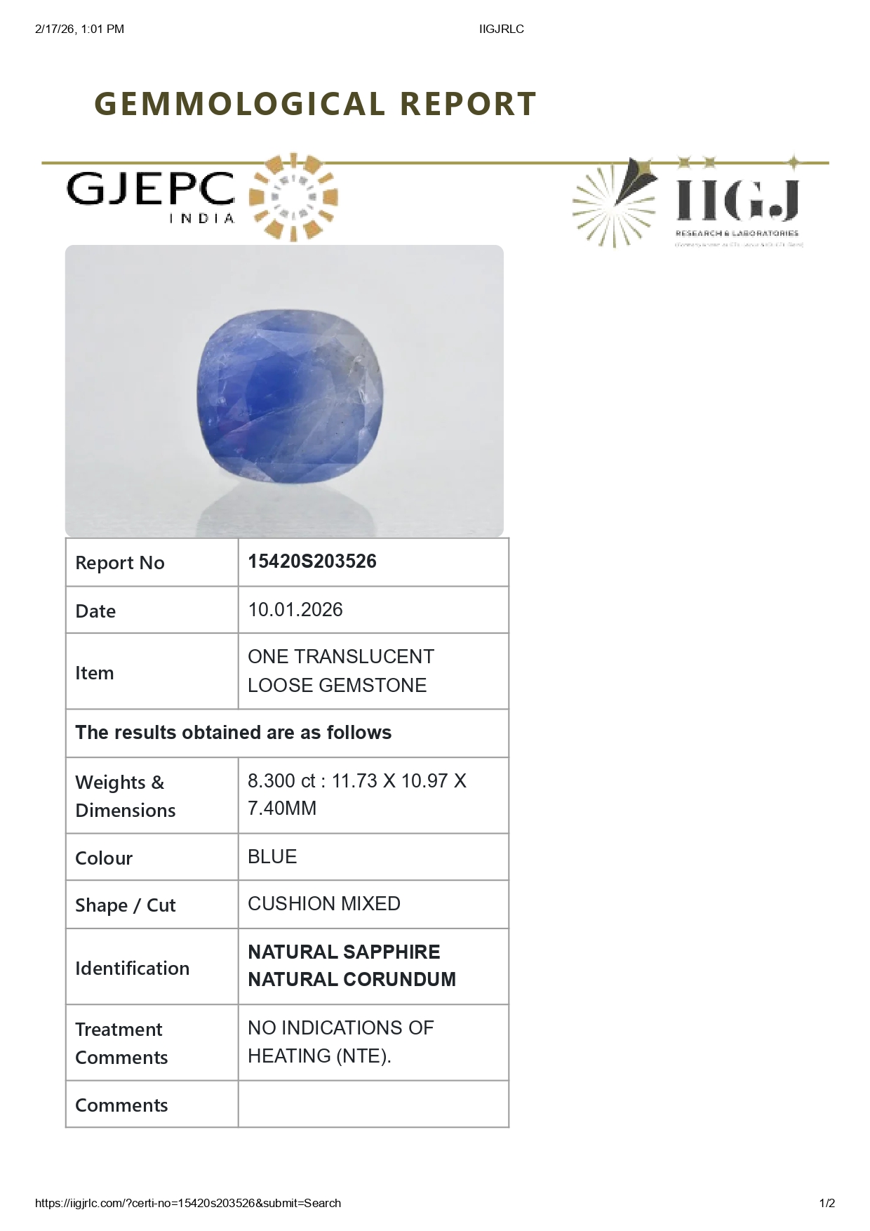 Buy one beautiful 8.30 carat/ 9.12 ratti pure blue sapphire.It has a cushion shape and a clarity grade of clean (evaluated at eye level), good intense color intensity. The origin of this neelam stone is sri-lanka(ceylon). This real blue sapphires is unheated & untreated and certified from IIGJ goverment lab.