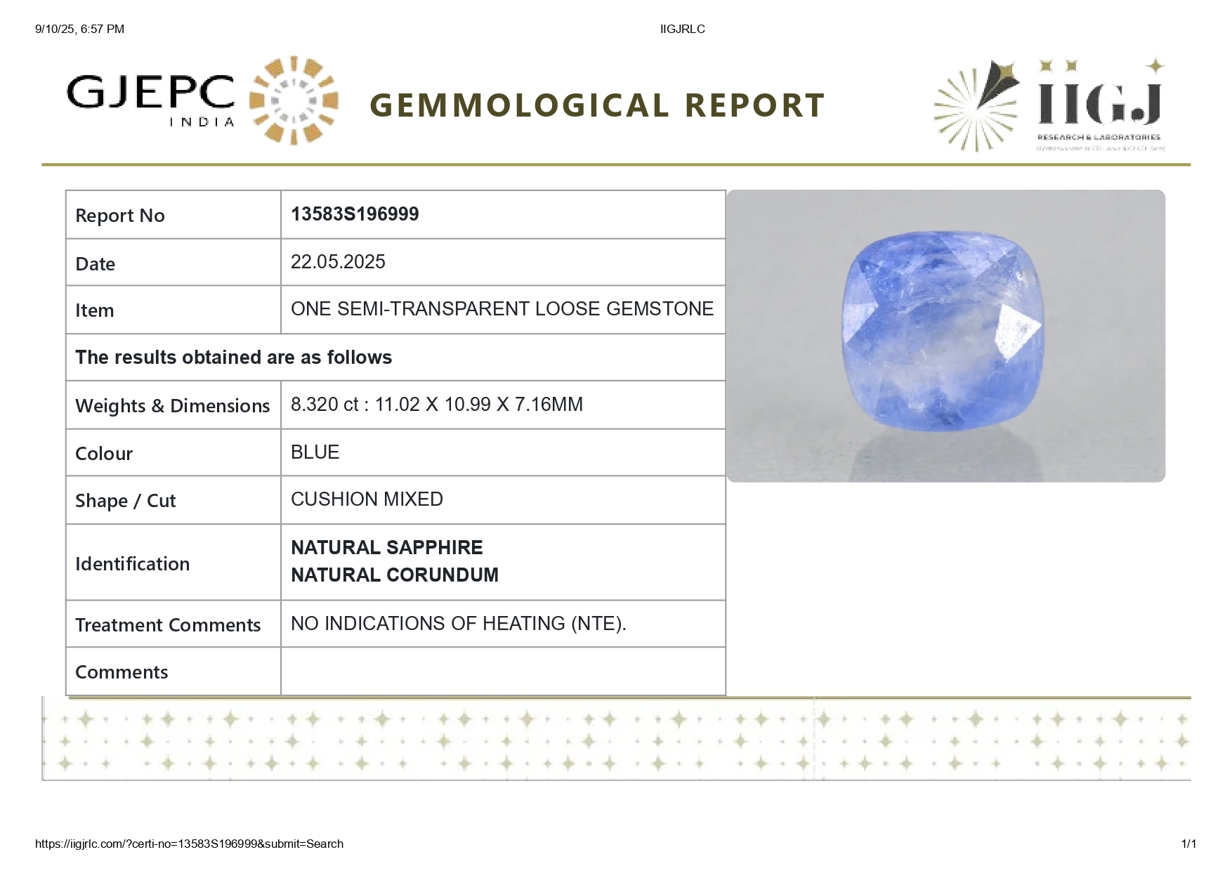Buy one beautiful 8.32 carat/ 9.14 ratti pure blue sapphire.It has a Cushion shape and a clarity grade of clean (evaluated at eye level), good intense color intensity. The origin of this neelam stone is sri-lanka(ceylon). This real blue sapphires is unheated & untreated and certified from IIGJ goverment lab.