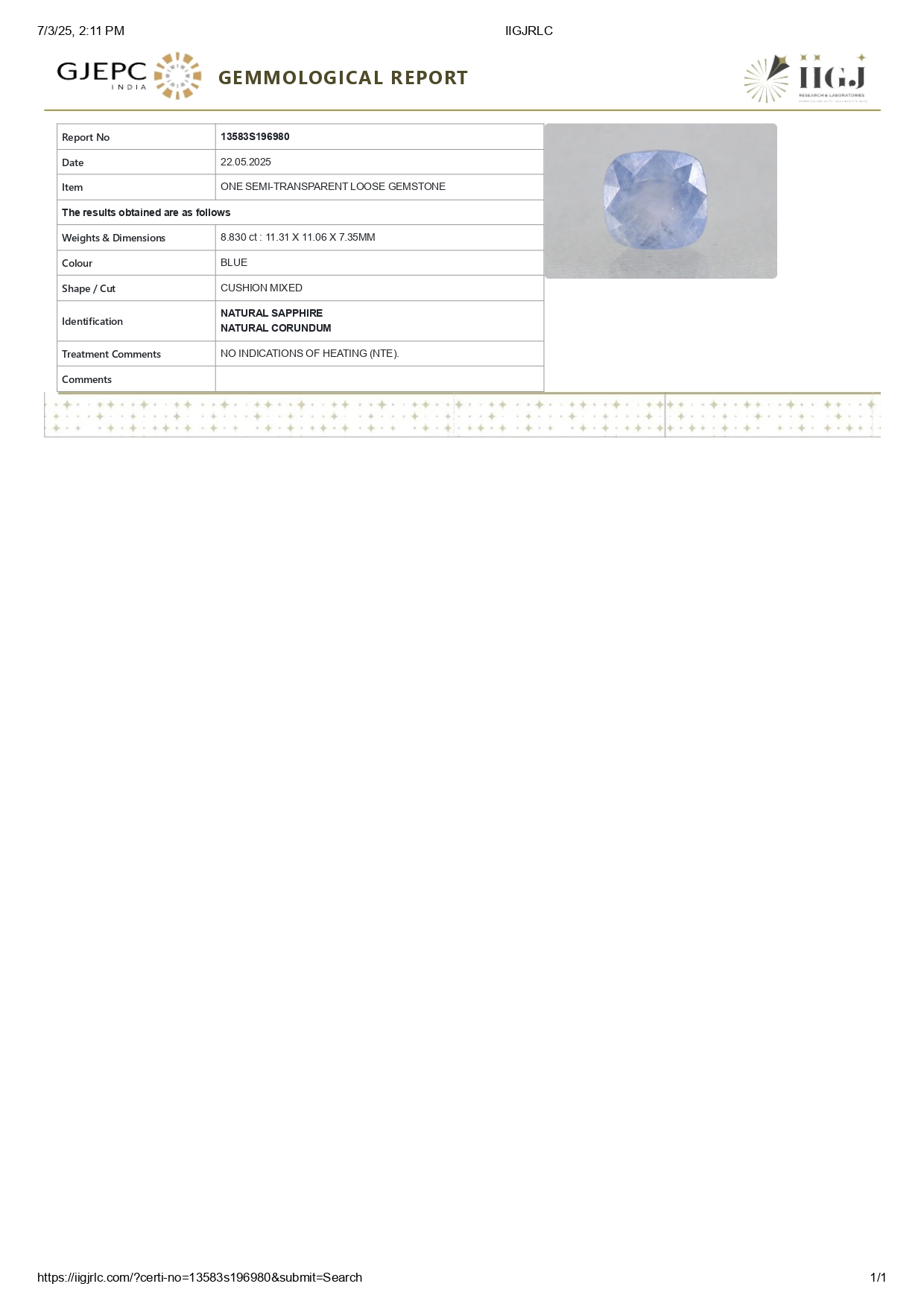 Buy one beautiful semi-transparent 8.83 carat/ 9.70 ratti pure blue sapphire.It has a cushion shape and a clarity grade of clean (evaluated at eye level), good intense color intensity. The origin of this neelam stone is sri-lanka(ceylon). This real blue sapphires is unheated & untreated and certified from IIGJ goverment lab.
