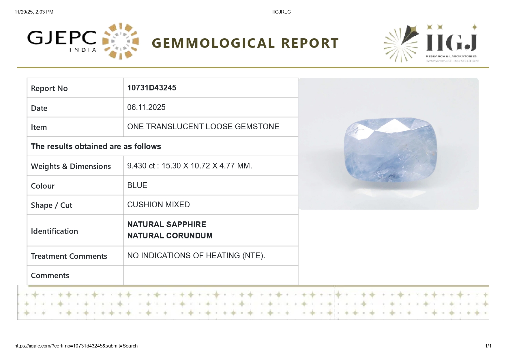 Buy one beautiful 9.43 carat/ 10.36 ratti pure blue sapphire.It has a cushion shape and a clarity grade of clean (evaluated at eye level), good intense color intensity. The origin of this neelam stone is sri-lanka(ceylon). This real blue sapphires is unheated & untreated and certified from IIGJ goverment lab.