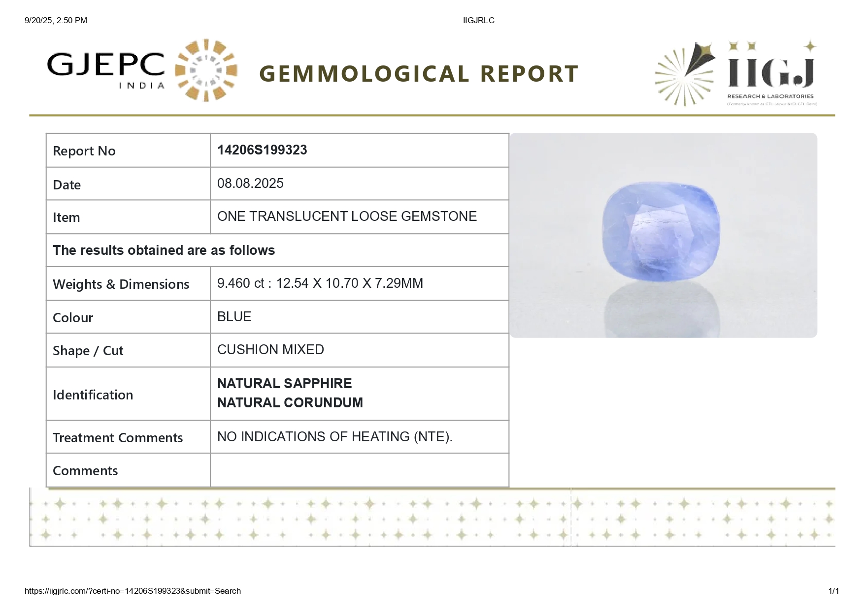 Buy one beautiful 9.46 carat/ 10.40 ratti pure blue sapphire.It has a Cushion shape and a clarity grade of clean (evaluated at eye level), good intense color intensity. The origin of this neelam stone is sri-lanka(ceylon). This real blue sapphires is unheated & untreated and certified from IIGJ goverment lab.