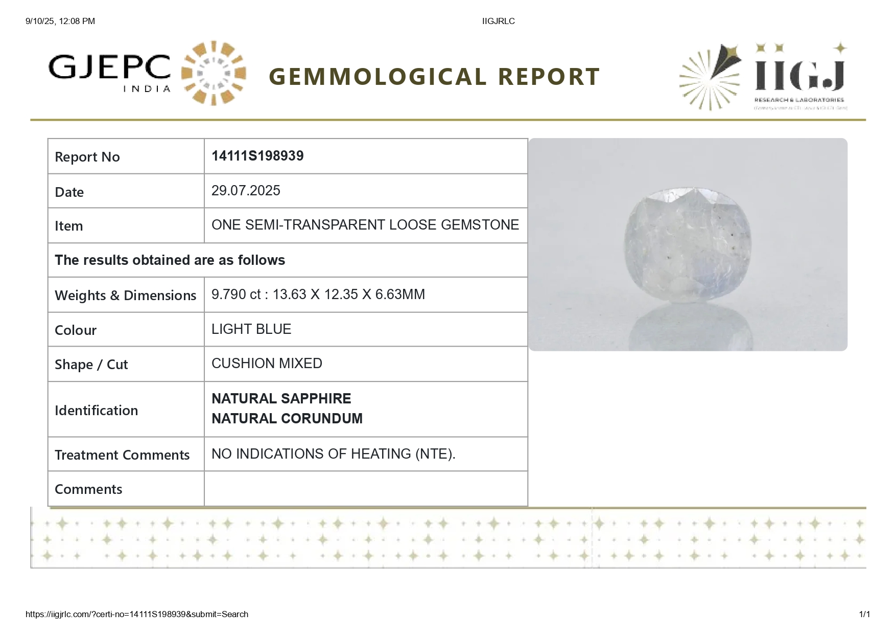 Buy one beautiful transparent 9.79 carat/ 10.76 ratti pure blue sapphire.It has a cushion shape and a clarity grade of clean (evaluated at eye level), good intense color intensity. The origin of this neelam stone is sri-lanka(ceylon). This real blue sapphires is unheated & untreated and certified from IIGJ goverment lab.
