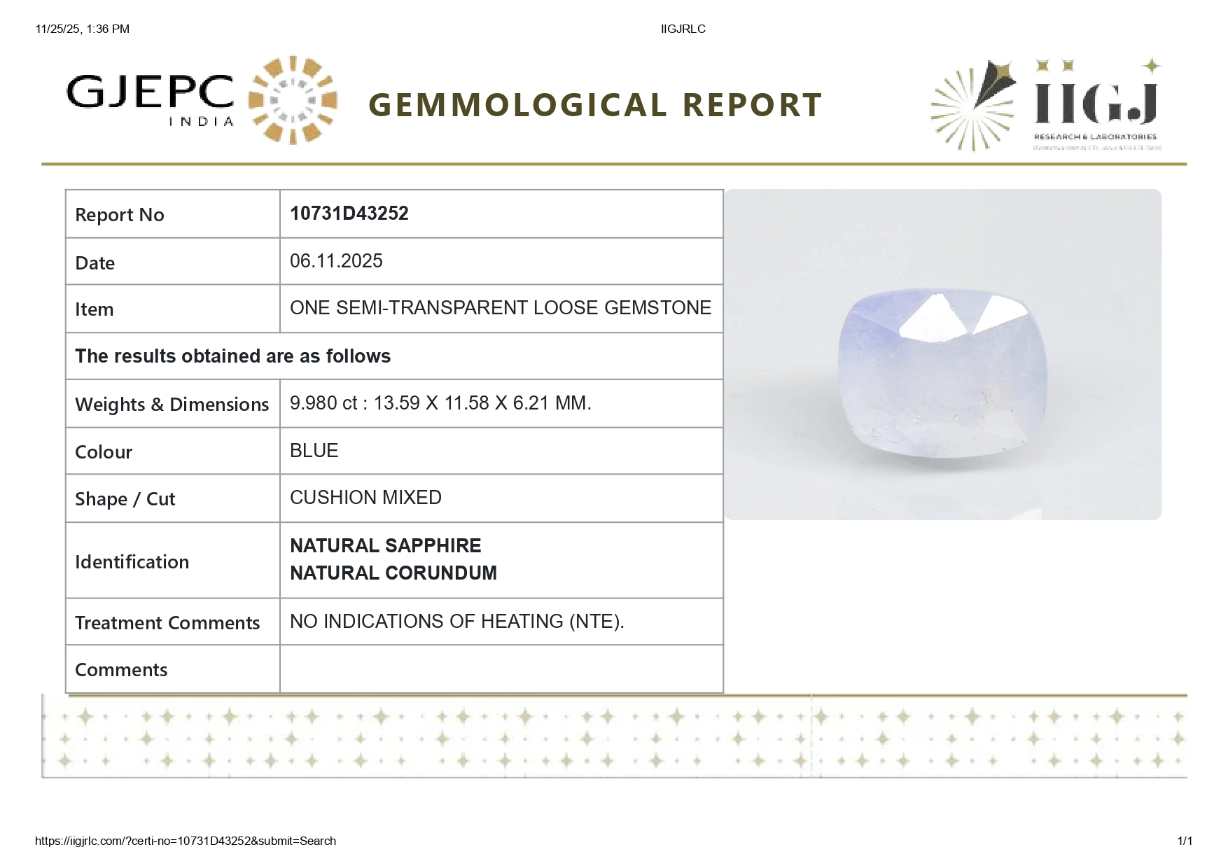Buy one beautiful 9.98 carat/ 10.97 ratti pure blue sapphire.It has a cushi shape and a clarity grade of clean (evaluated at eye level), good intense color intensity. The origin of this neelam stone is sri-lanka(ceylon). This real blue sapphires is unheated & untreated and certified from IIGJ goverment lab.