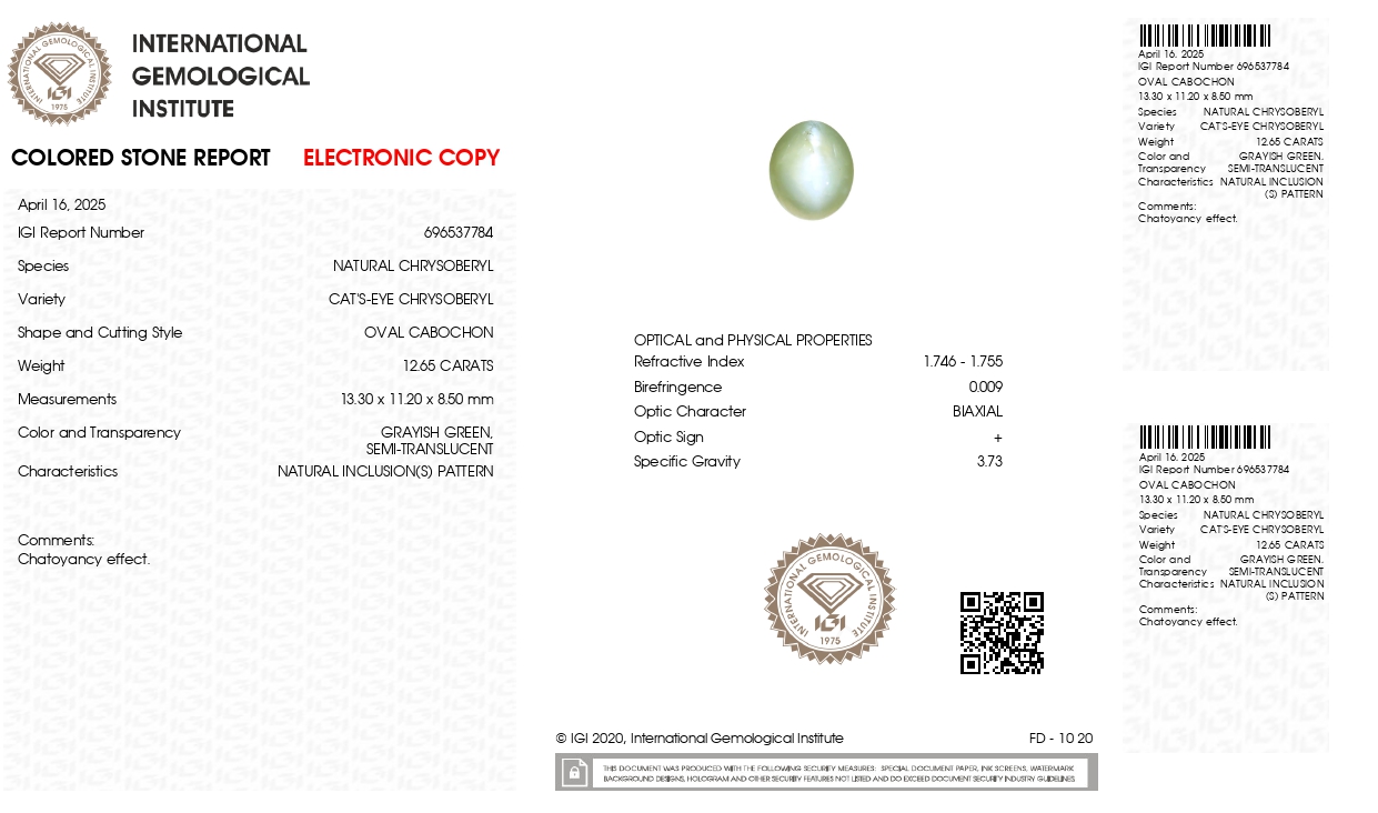 100% Natural Cat's Eye (Lahsuniya) for sale online 12.65 carats (13.90 Ratti).Cat's Eye is a found in shades of colours like grey, black, honey & yellowish green. Chrysoberyl Cat's Eye (Lahsuniya) generally comes from Sri Lanka, Brazil, India, and is worn for the dark planet Ketu. The stone benefits most during the Dasha or the malefic phase of Ketu. This Lehsunia stone is govt lab certified and its photos videos and certificates are available online.