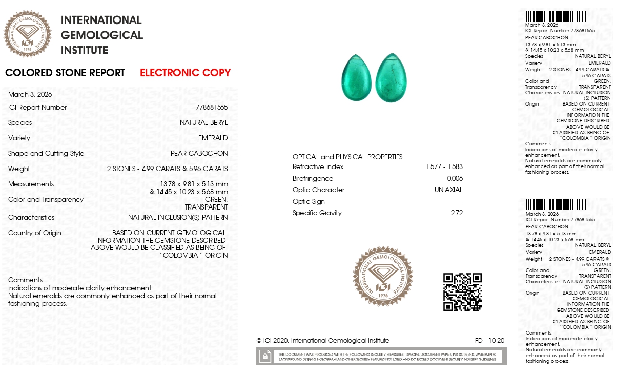 Buy one beautiful transparent 10.95 Carat/ 12.03 Ratti original Emerald. It has a pear shape and a clarity grade of eye clean (evaluated at eye level), medium Green color intensity, and an excellent polish. The origin of this emerald is Columbian. This emerald stone is unheated & untreated and certified from IGI Govt. Lab.