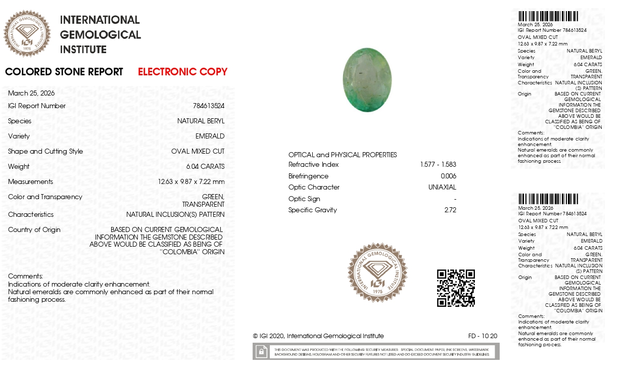 Buy one beautiful transparent 6.04 Carat/ 6.64 Ratti original Emerald online. It has Oval shape and a clarity grade of eye clean (evaluated at eye level), medium Green color intensity, and an excellent polish. The origin of this emerald is Columbian. This emerald stone is unheated & untreated and certified from IGI Govt. Lab.