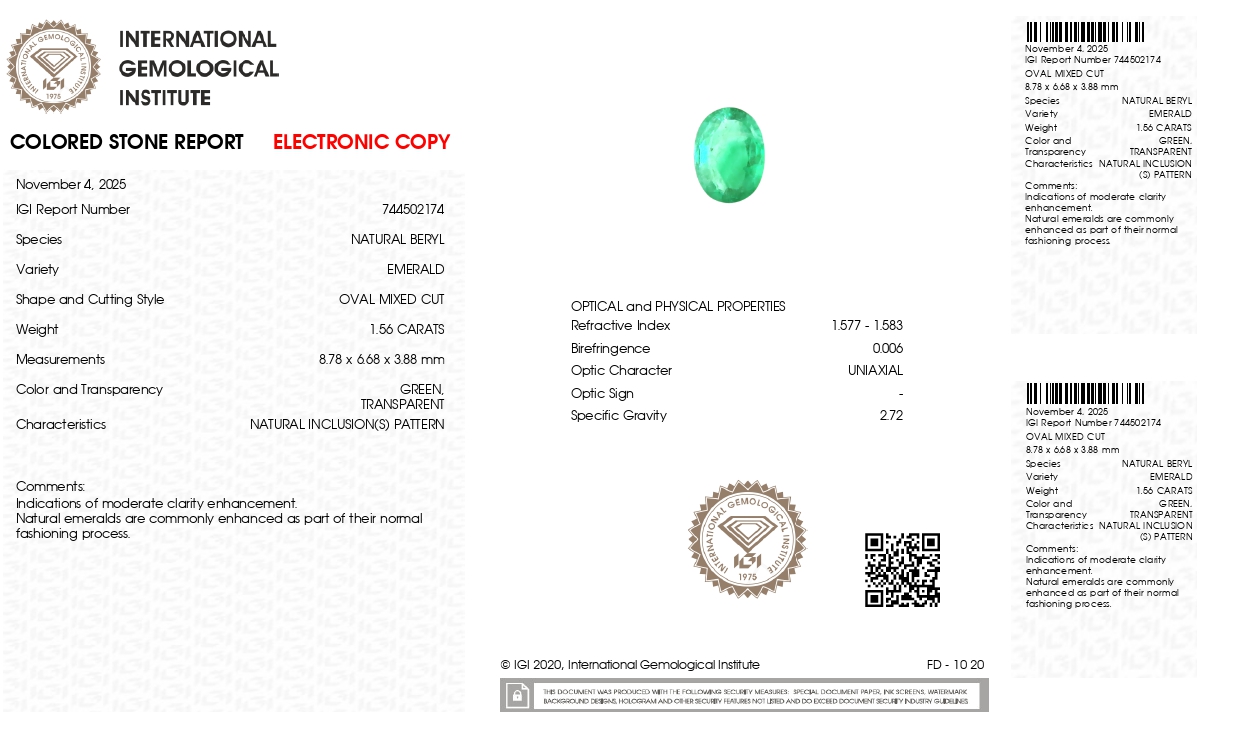 Buy one beautiful transparent 1.56 Carat/ 1.71 Ratti original Emerald online. It has a oval shape and a clarity grade of eye clean (evaluated at eye level), medium Green color intensity, and an excellent polish. The origin of this emerald is Zambia. This emerald stone is unheated & untreated and certified from IGI Govt. lab.