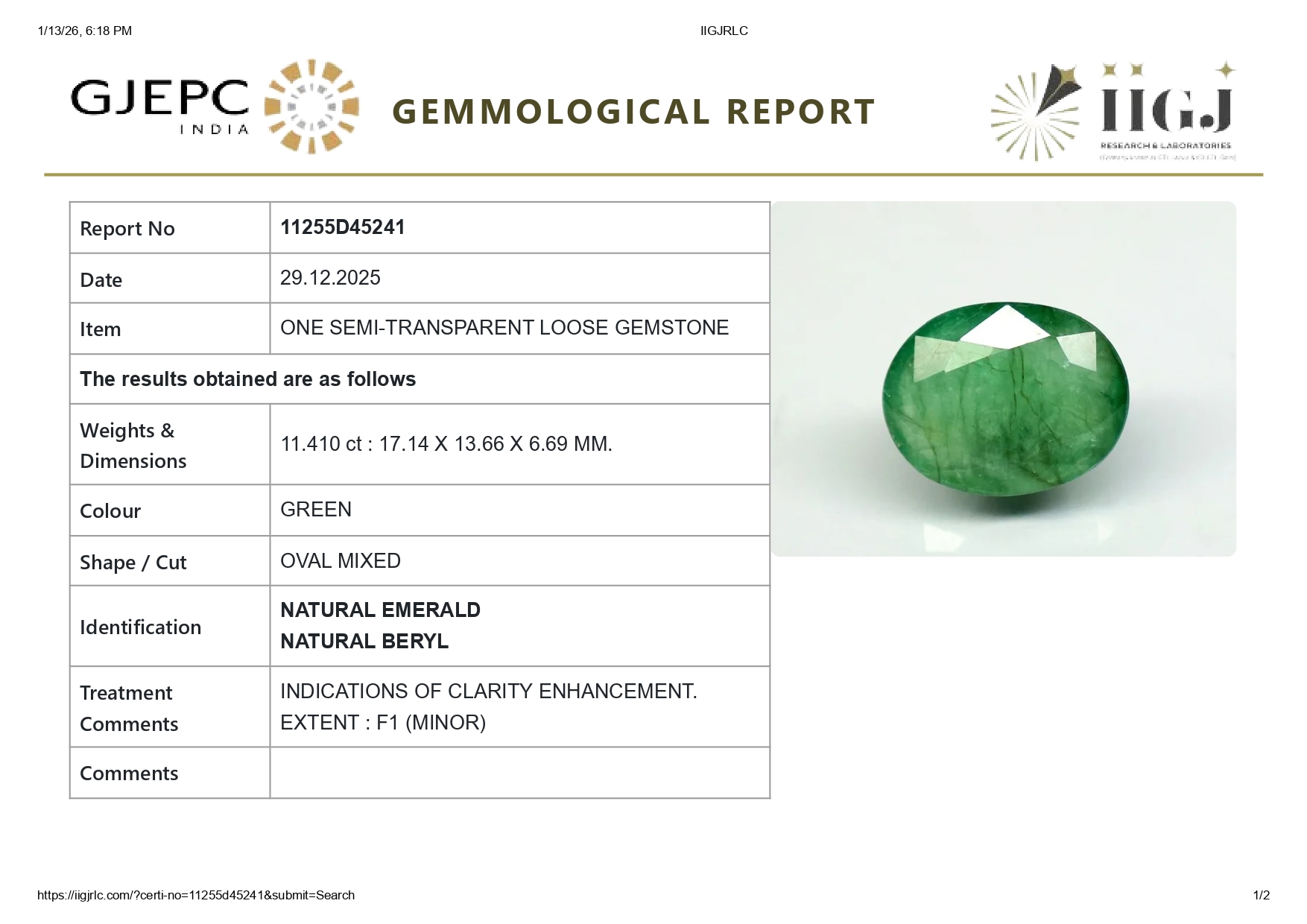 Buy one beautiful translucent 11.41 Carat/ 12.54 Ratti original Emerald online. It has a Oval shape and a clarity grade of eye clean (evaluated at eye level), medium Green color intensity, and an excellent polish. The origin of this emerald is Zambia. This emerald stone is unheated & untreated and certified from IIGJ Govt. lab.