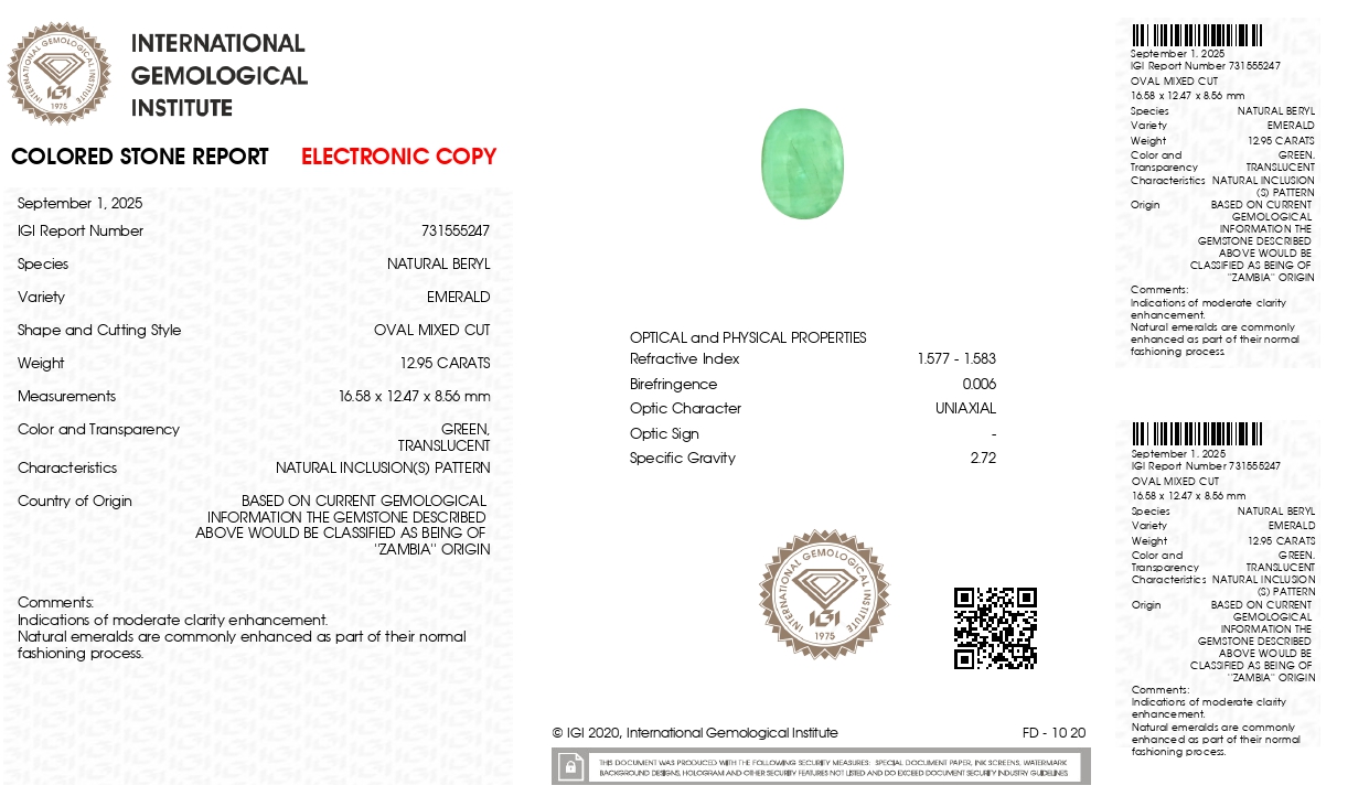 Buy one beautiful semi-transparent 12.95 Carat/ 14.23 Ratti original Emerald online.clarity grade of eye clean (evaluated at eye level), medium Green color intensity, and an excellent polish. The origin of this emerald is Zambia. This emerald stone is unheated & untreated and certified from IGI Govt. lab.