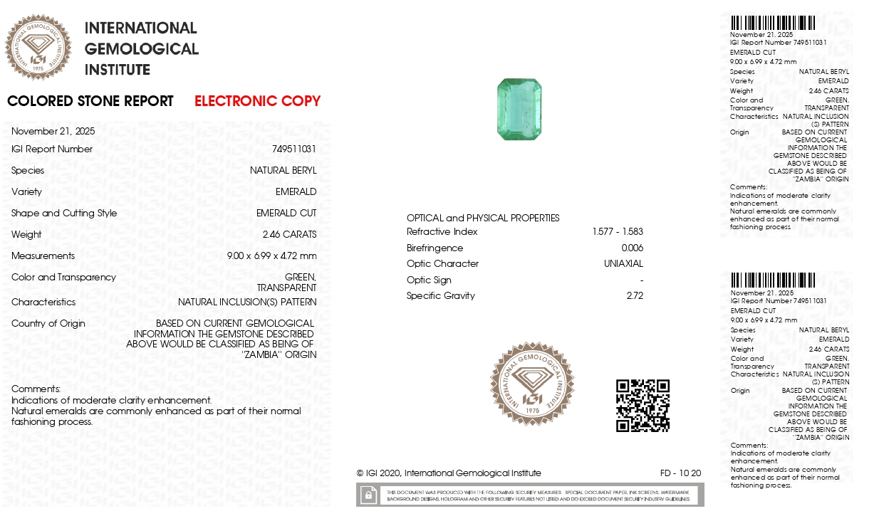 Buy one beautiful transparent 2.46 Carat/ 2.70 Ratti original Emerald online. It has a emerald cut shape and a clarity grade of eye clean (evaluated at eye level), medium Green color intensity, and an excellent polish. The origin of this emerald is Zambia. This emerald stone is unheated & untreated and certified from IGI Govt. Lab.