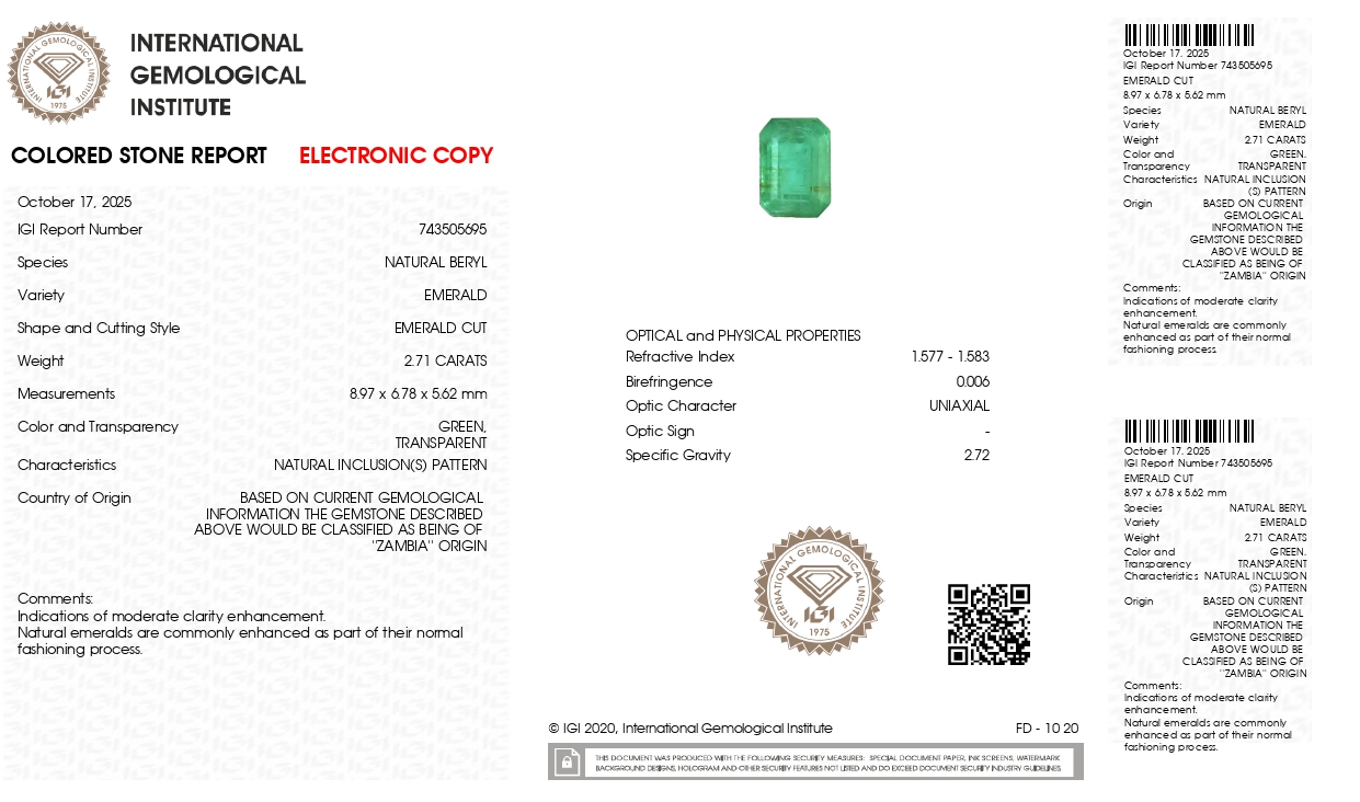 Buy one beautiful transparent 2.71 Carat/ 2.98 Ratti original Emerald online. It has a emerald cut shape and a clarity grade of eye clean (evaluated at eye level), medium Green color intensity, and an excellent polish. The origin of this emerald is Zambia. This emerald stone is unheated & untreated and certified from IGI Govt. Lab.