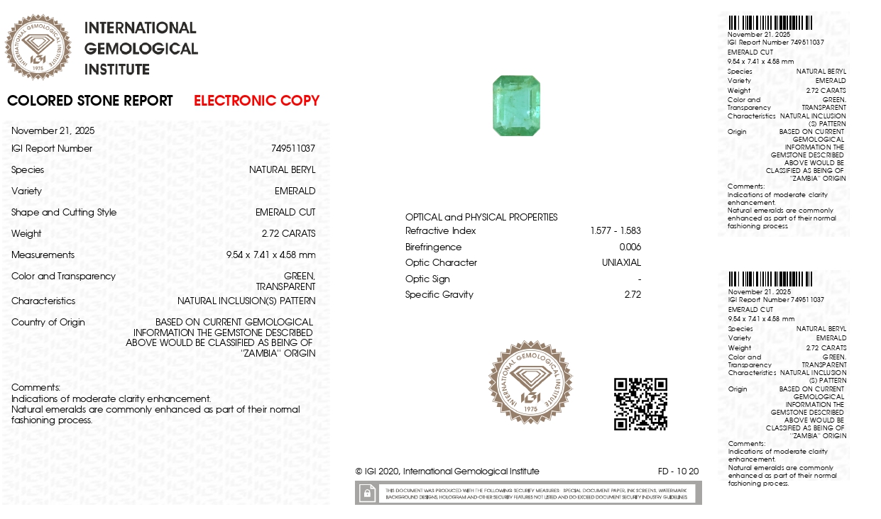 Buy one beautiful transparent 2.72 Carat/ 2.99 Ratti original Emerald online. It has a Emerald cut shape and a clarity grade of eye clean (evaluated at eye level), medium Green color intensity, and an excellent polish. The origin of this emerald is Zambia. This emerald stone is unheated & untreated and certified from IGI Govt. Lab.