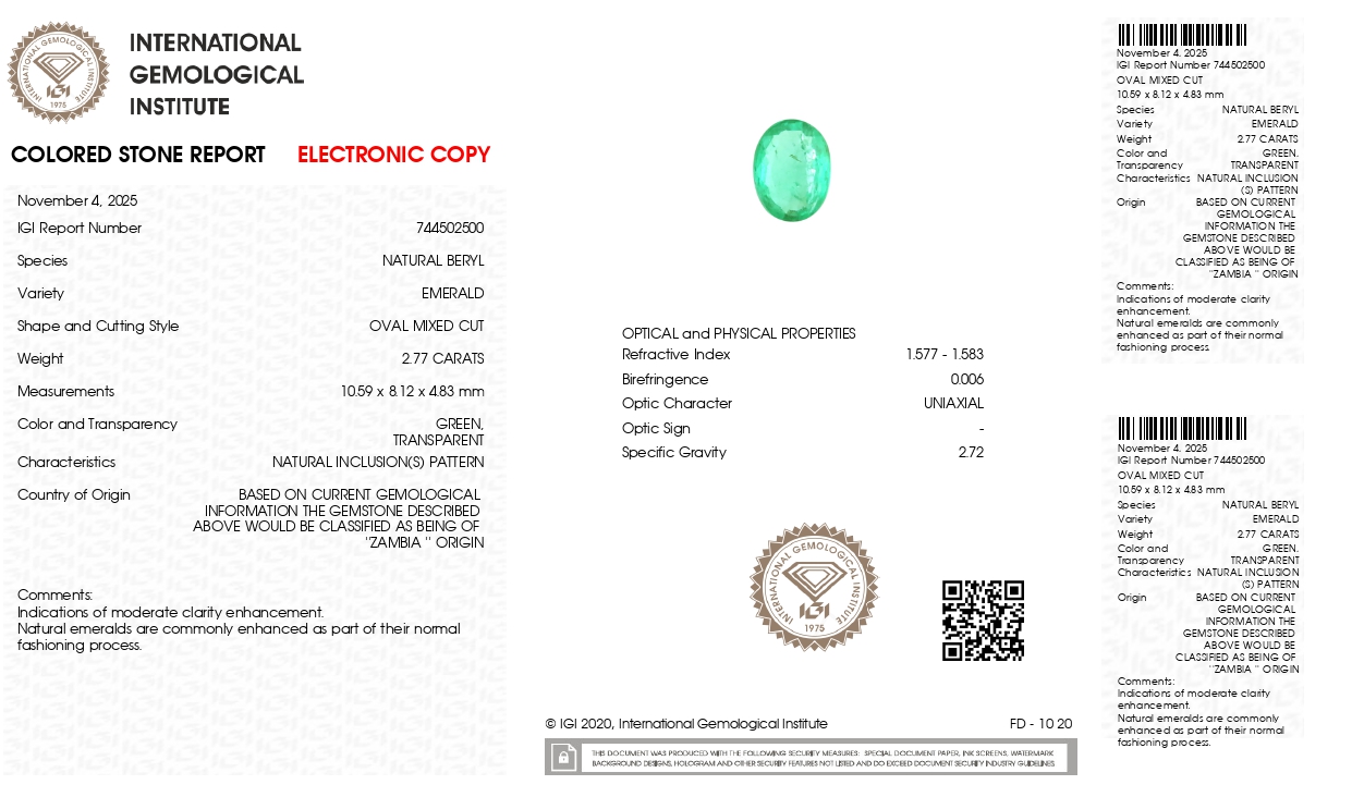 Buy one beautiful transparent 2.77 Carat/ 3.04 Ratti original Emerald online. It has a Oval shape and a clarity grade of eye clean (evaluated at eye level), medium Green color intensity, and an excellent polish. The origin of this emerald is Zambia. This emerald stone is unheated & untreated and certified from IGI Govt. lab.